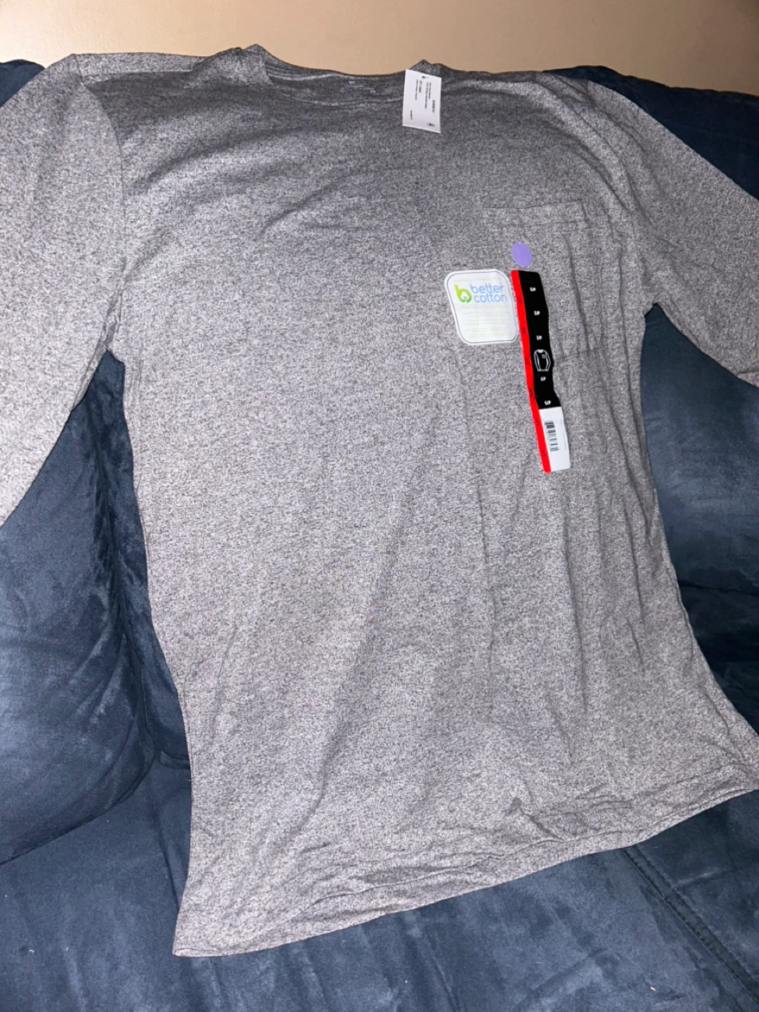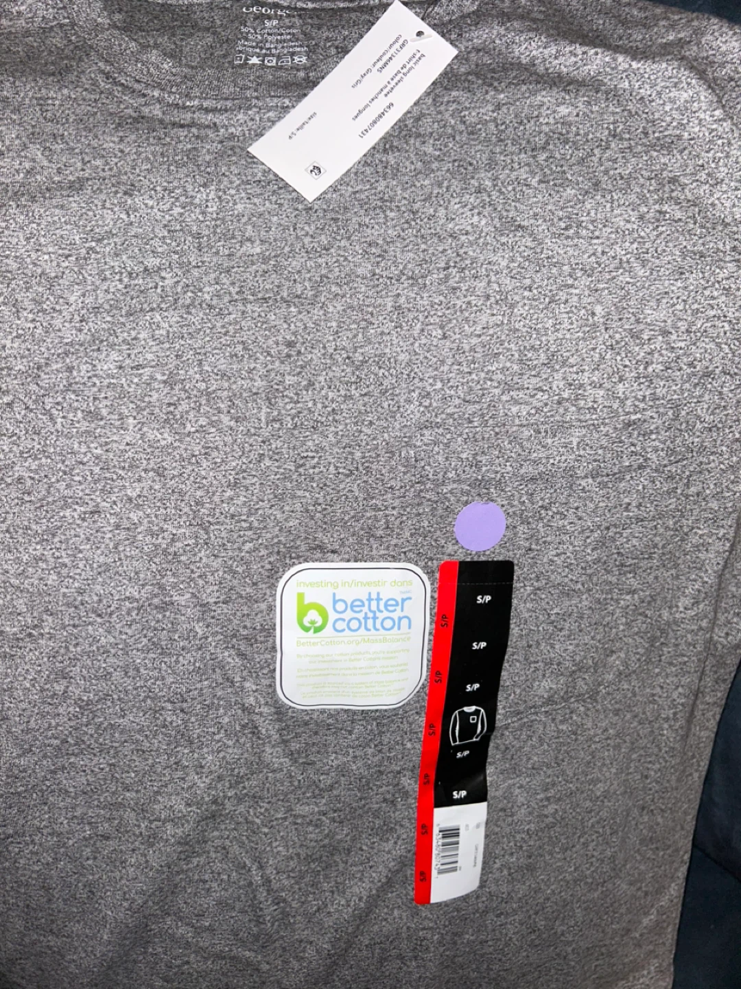 Brand new with tags, this ladies George long-sleeve tee is a size small and comes in a heather grey colour. It's made of 50% cotton and 50% polyester. I bought the wrong size and was too embarrassed to take it back. My loss is your gain