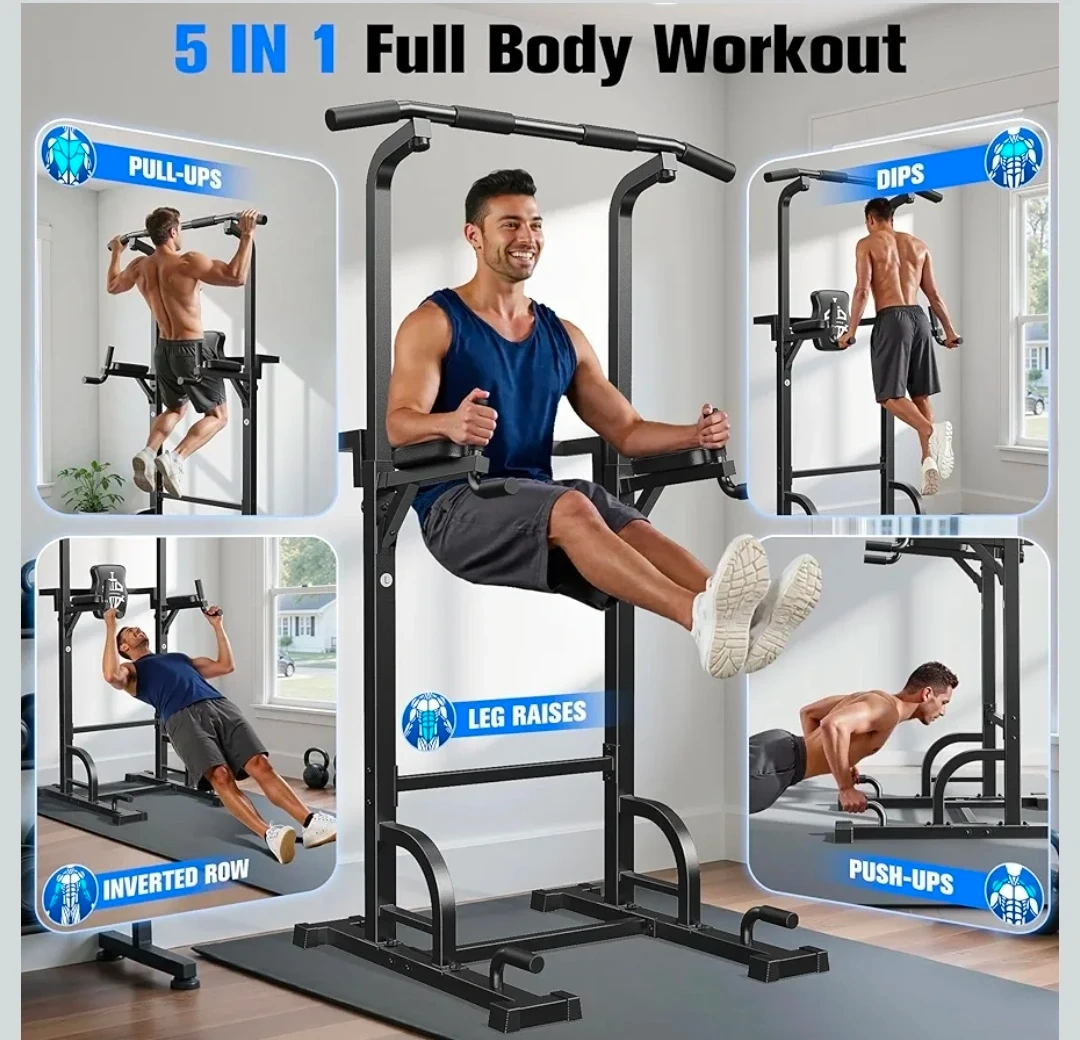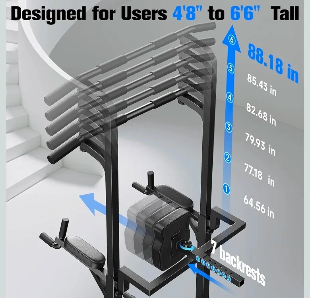 This power tower offers a full-body workout with multiple stations. It's designed for users between 4'8" and 6'6" tall. Built for pull-ups, dips, leg raises, and push-ups.