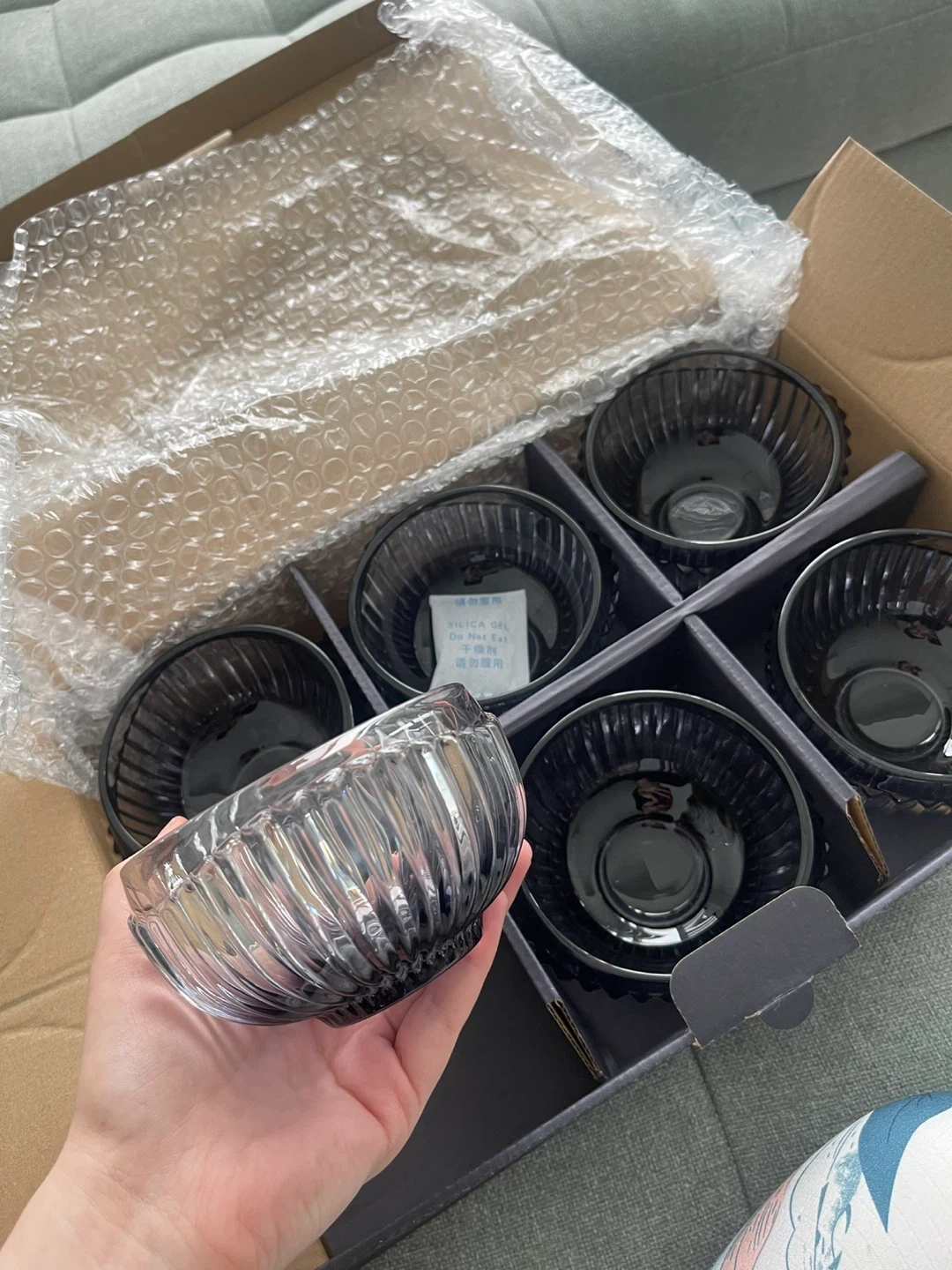 This is a set of six black glass bowls. They feature a ribbed design and come in their original packaging. These bowls are suitable for serving snacks or desserts.