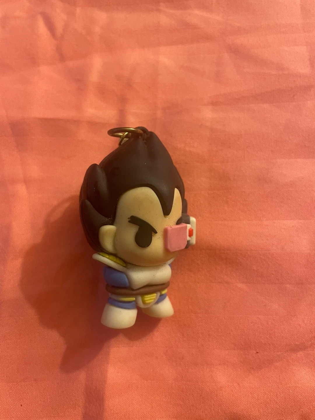 This is a cute keychain featuring Vegeta from Dragon Ball Z. It's made of durable PVC material. Perfect for fans of the anime!