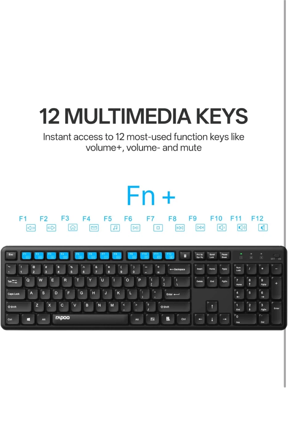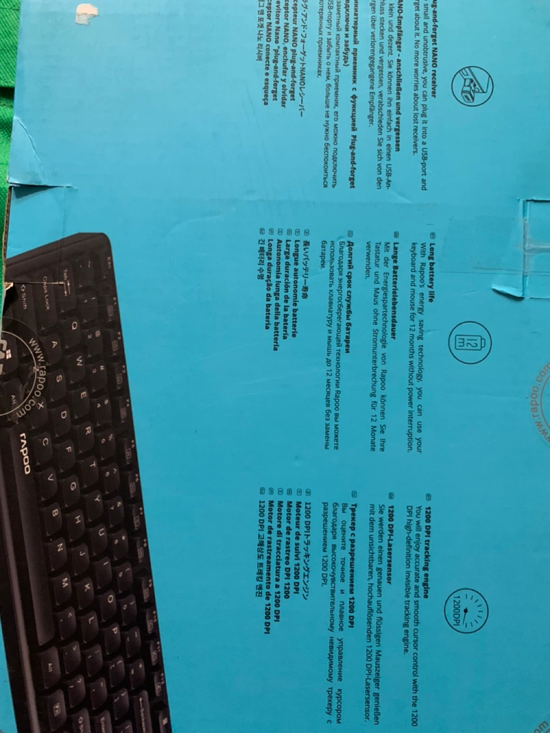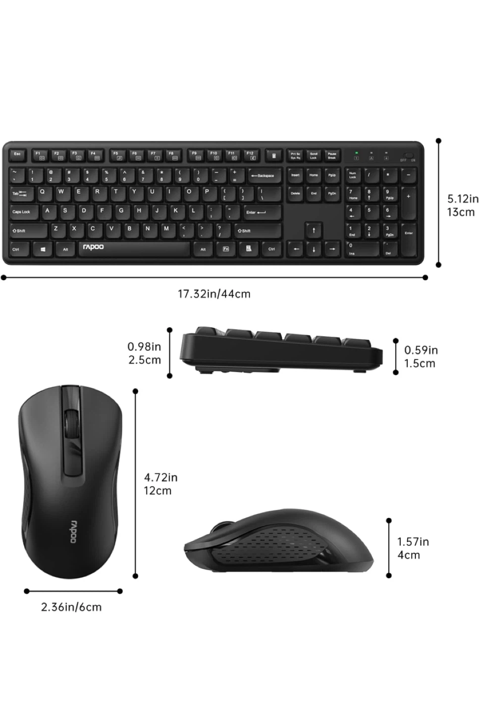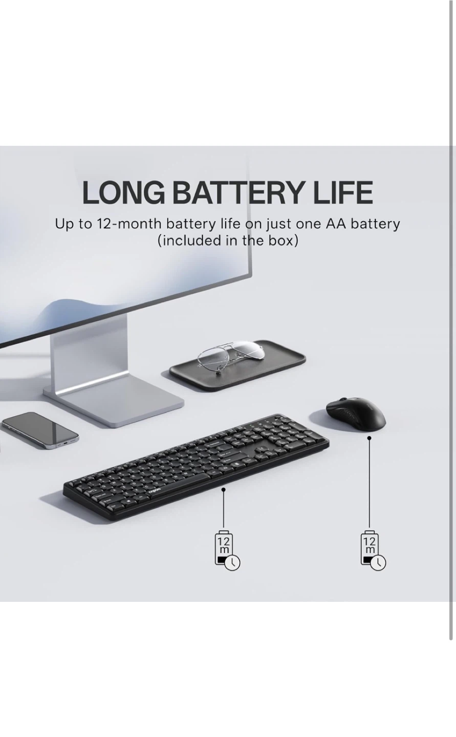 This Rapoo wireless keyboard and mouse combo features a 105-key full-size layout with a number pad for comfortable typing. It's designed for easy plug-and-play setup. The mouse offers 1200 DPI tracking for smooth cursor control.