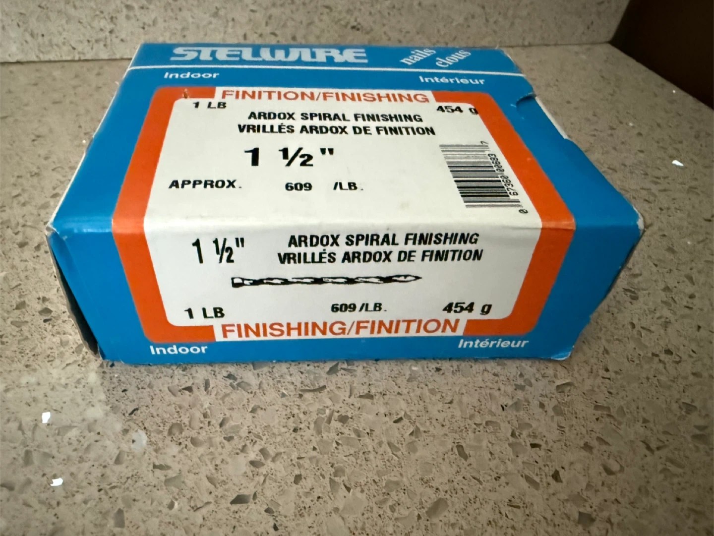 Selling a box of Stelwire Ardox Spiral Finishing Nails. These are 1 1/2" in size and are ideal for indoor finishing projects. The box contains 1 lb (454g) of nails.