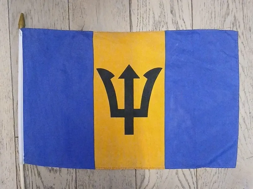 This is a handheld flag of Barbados. It features the blue and yellow vertical stripes with the black trident emblem. Fabric material. Includes a white pole with a gold tip. Small size. ONE FLAG $15 YOU BUY FIVE OR MORE FLAGS , FIVE DOLLARS EACH!!!!!!