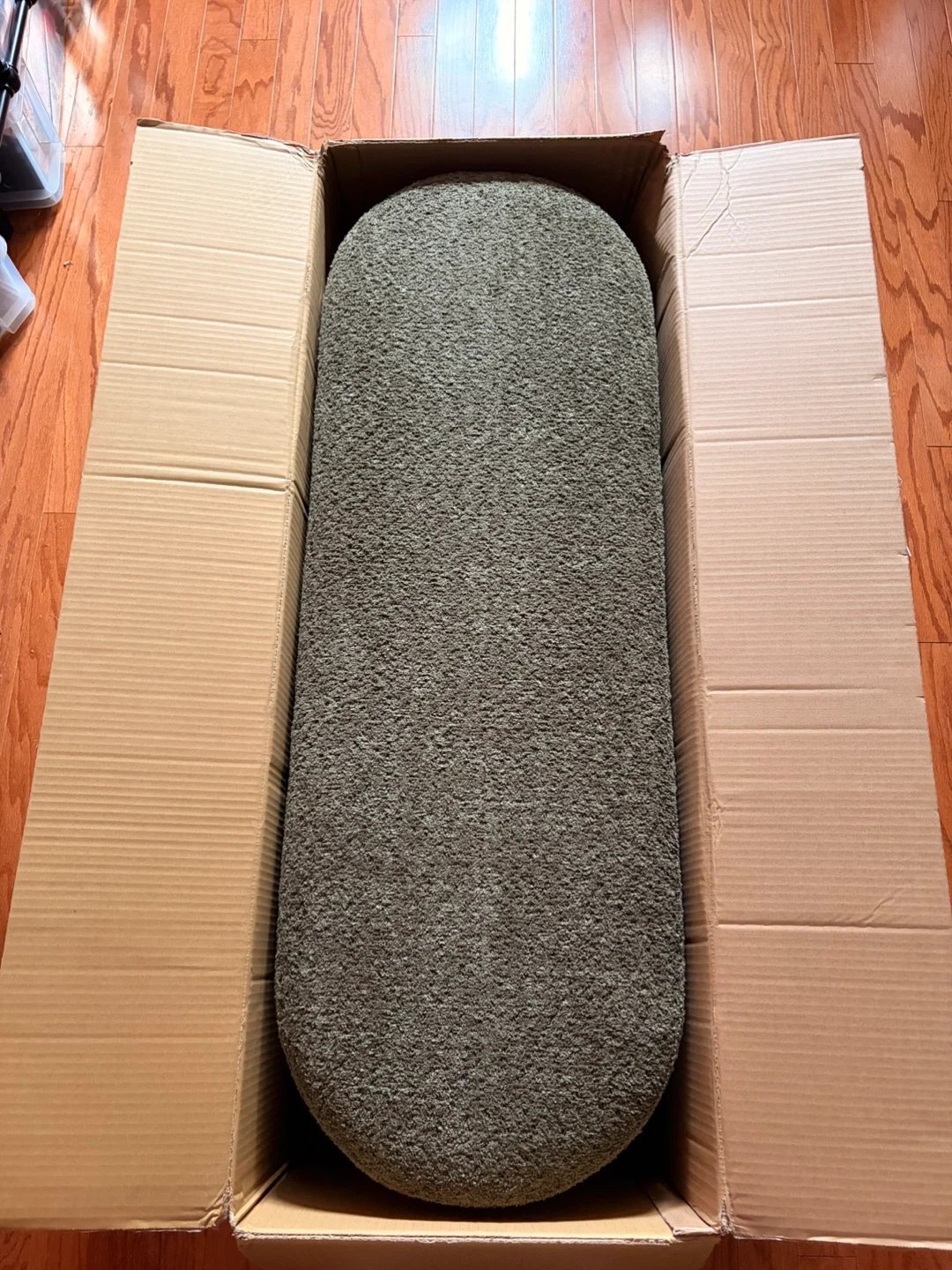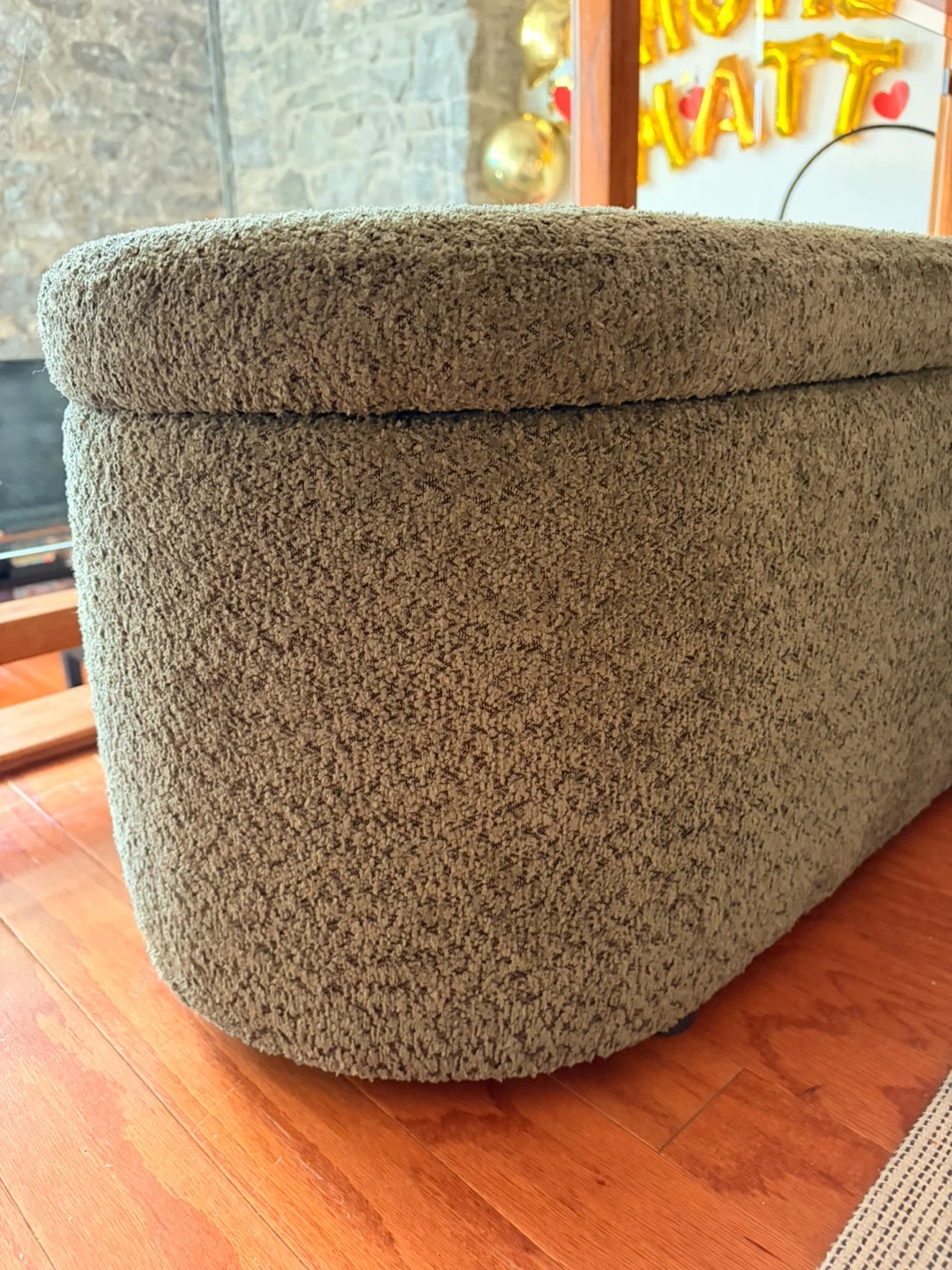 This is a green Structube Florence storage ottoman. It's upholstered and opens for storage inside. The ottoman's exterior is a textured green fabric. It's ideal for adding extra seating and storage to any room!