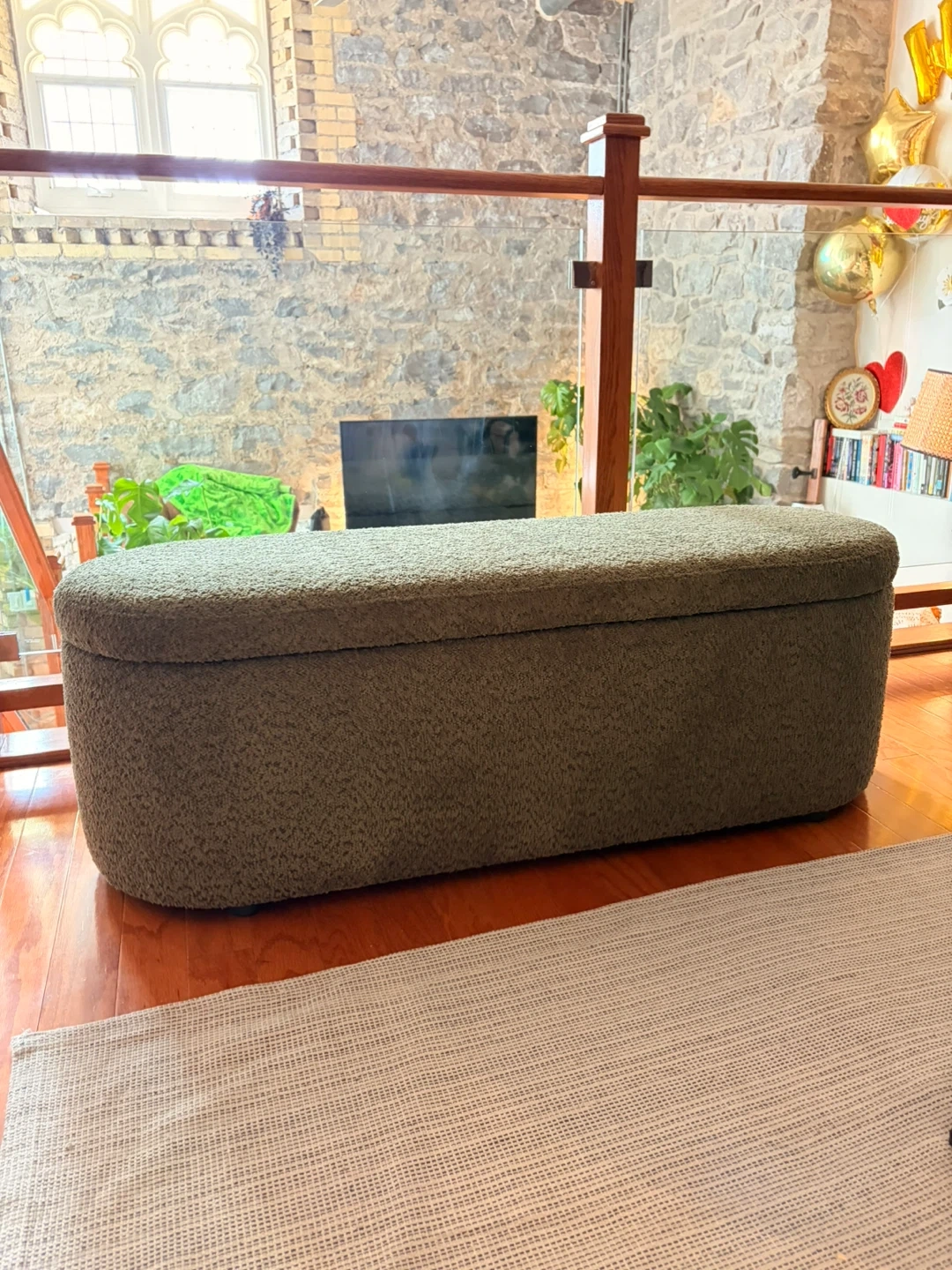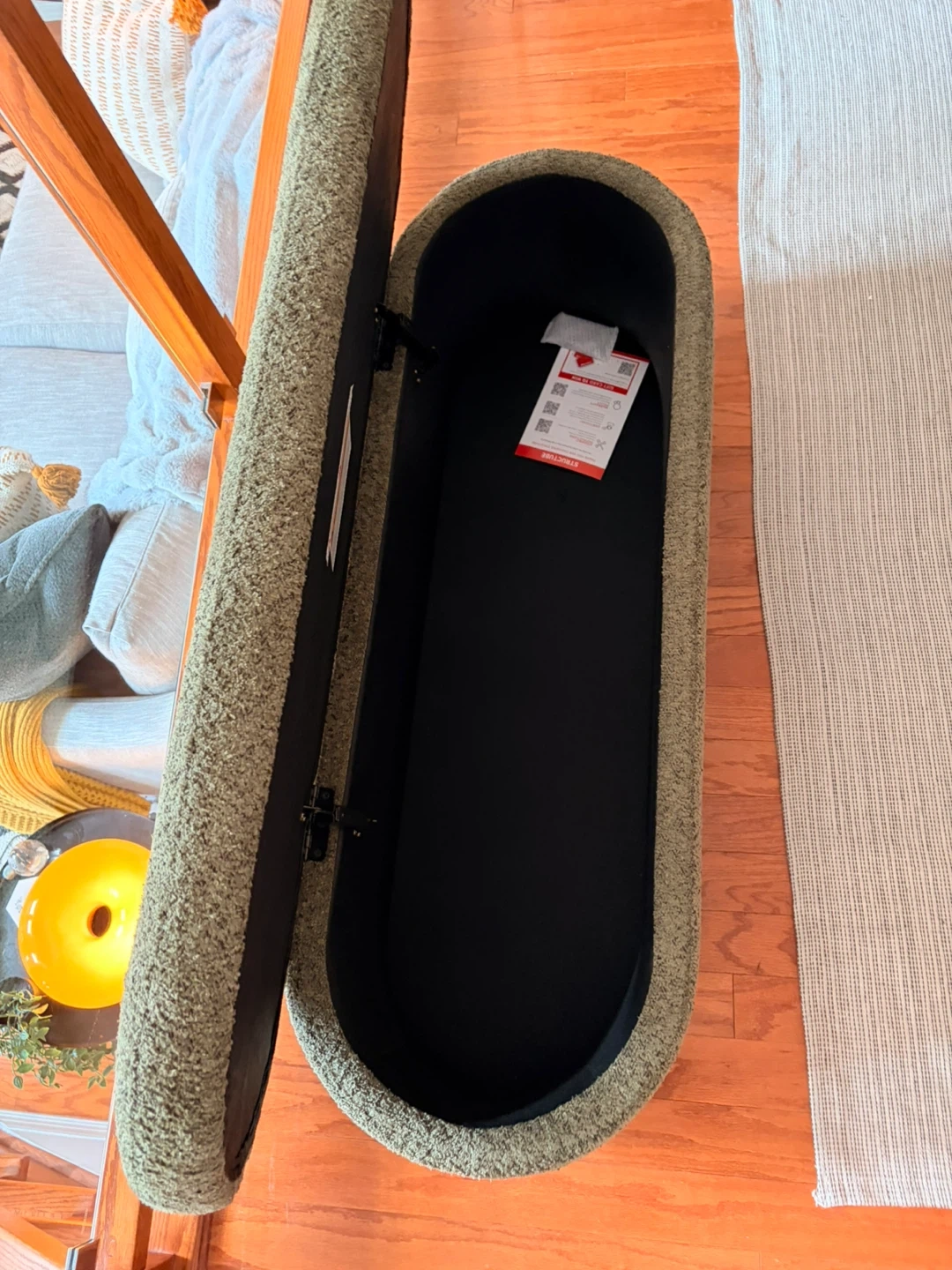 This is a green Structube Florence storage ottoman. It's upholstered and opens for storage inside. The ottoman's exterior is a textured green fabric. It's ideal for adding extra seating and storage to any room!