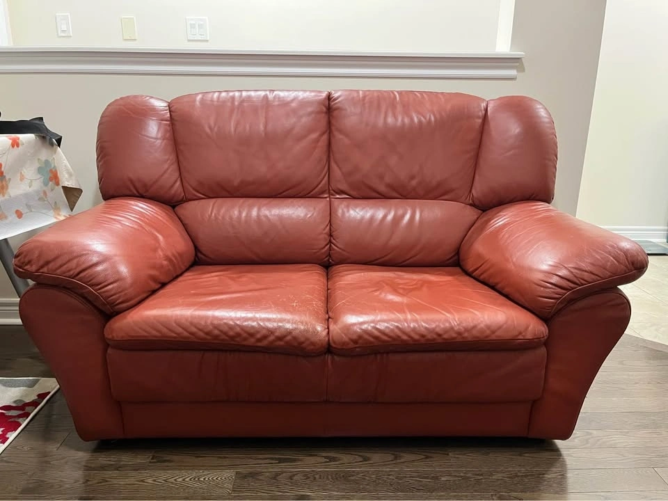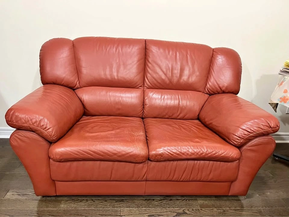 Selling a matching set of 2 genuine Italian leather loveseats. Originally purchased for $1200 each ($2400 total). Very comfortable, solid, and high-quality construction. Condition is good overall for their age, with normal leather wear and creasing. One loveseat has a small tear on the armrest (see photo). No structural issues. Still very comfortable and sturdy.