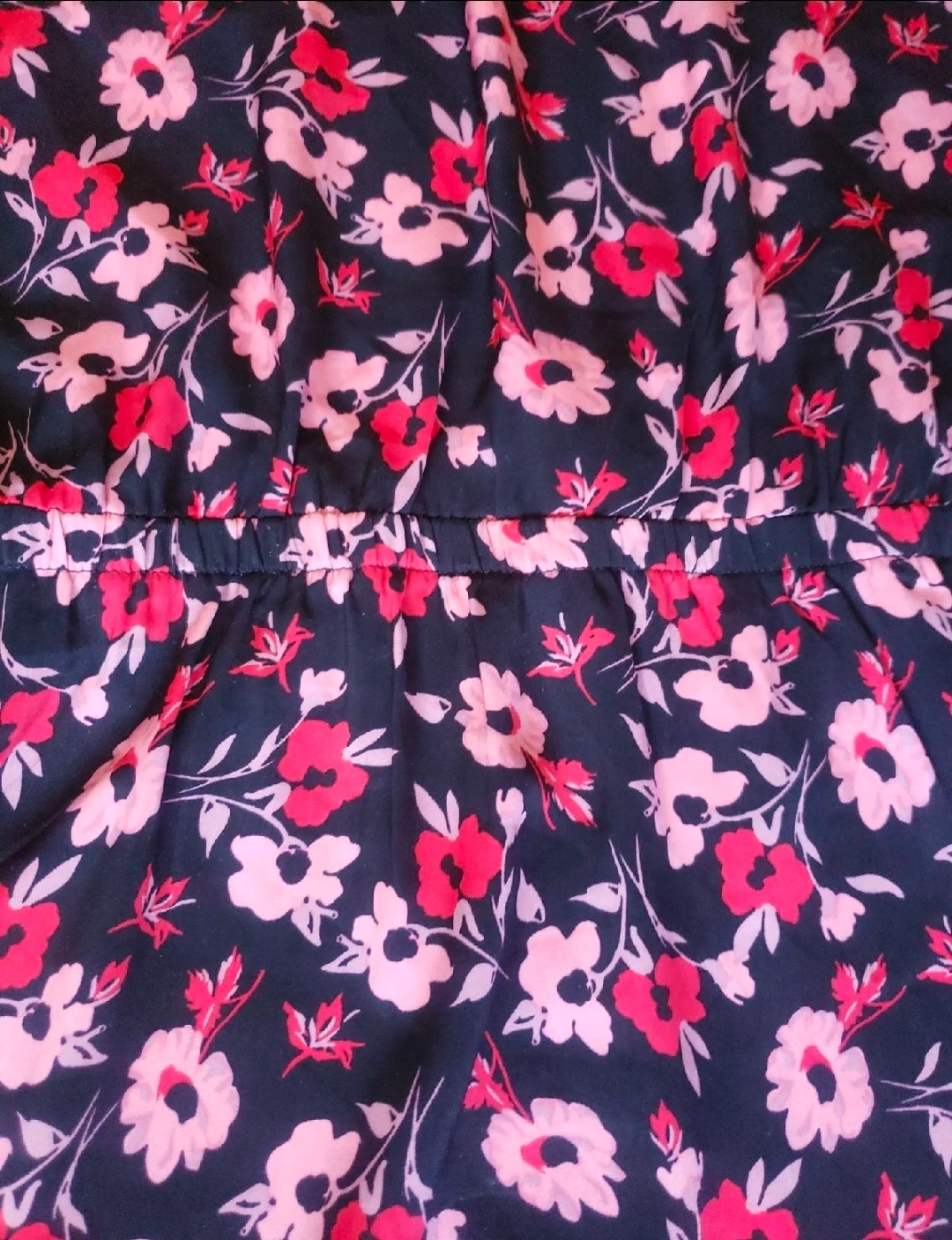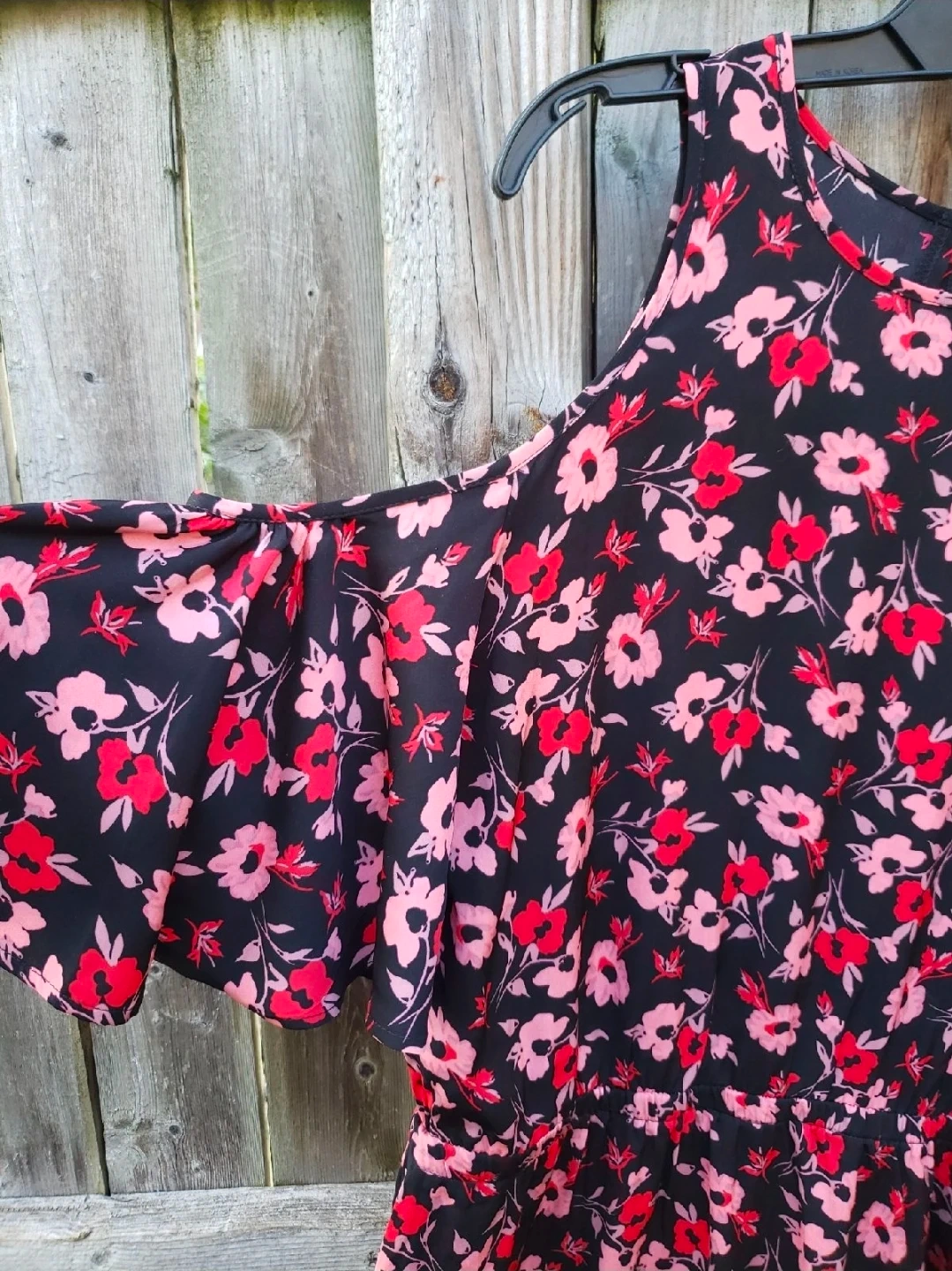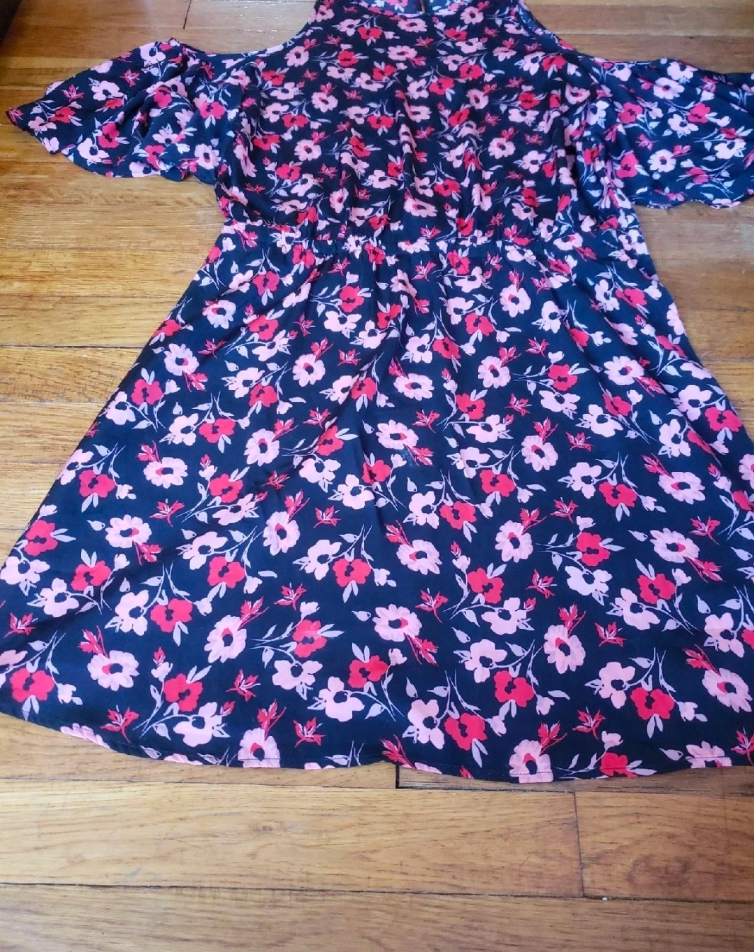This is a cute Express dress with a floral pattern! It has a cold shoulder design and is perfect for a casual outing or a summer day