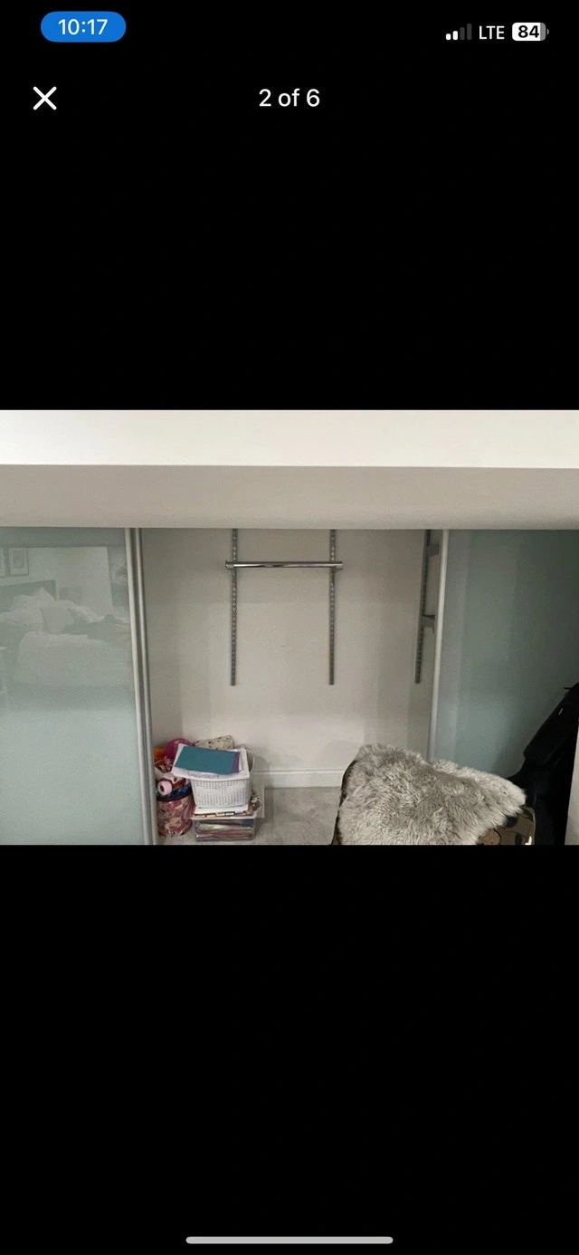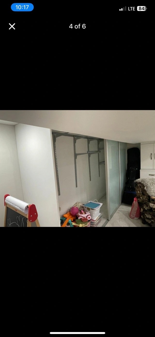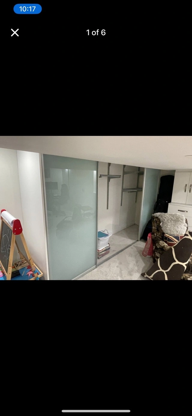 This is a used closet system that offers a practical storage solution. The system includes sliding doors, shelving, and rails for hanging clothes, providing ample space and organization. It's in good condition, ready to be installed and used in your home. If the ad is still up, it's still available!