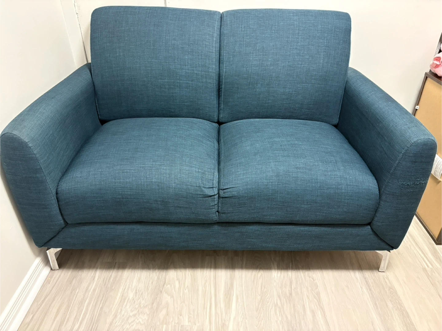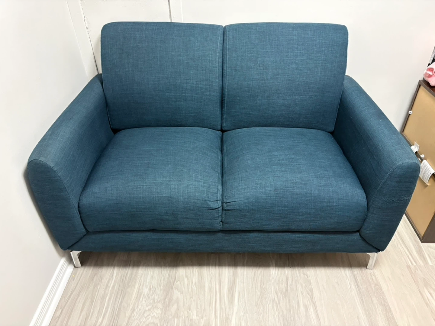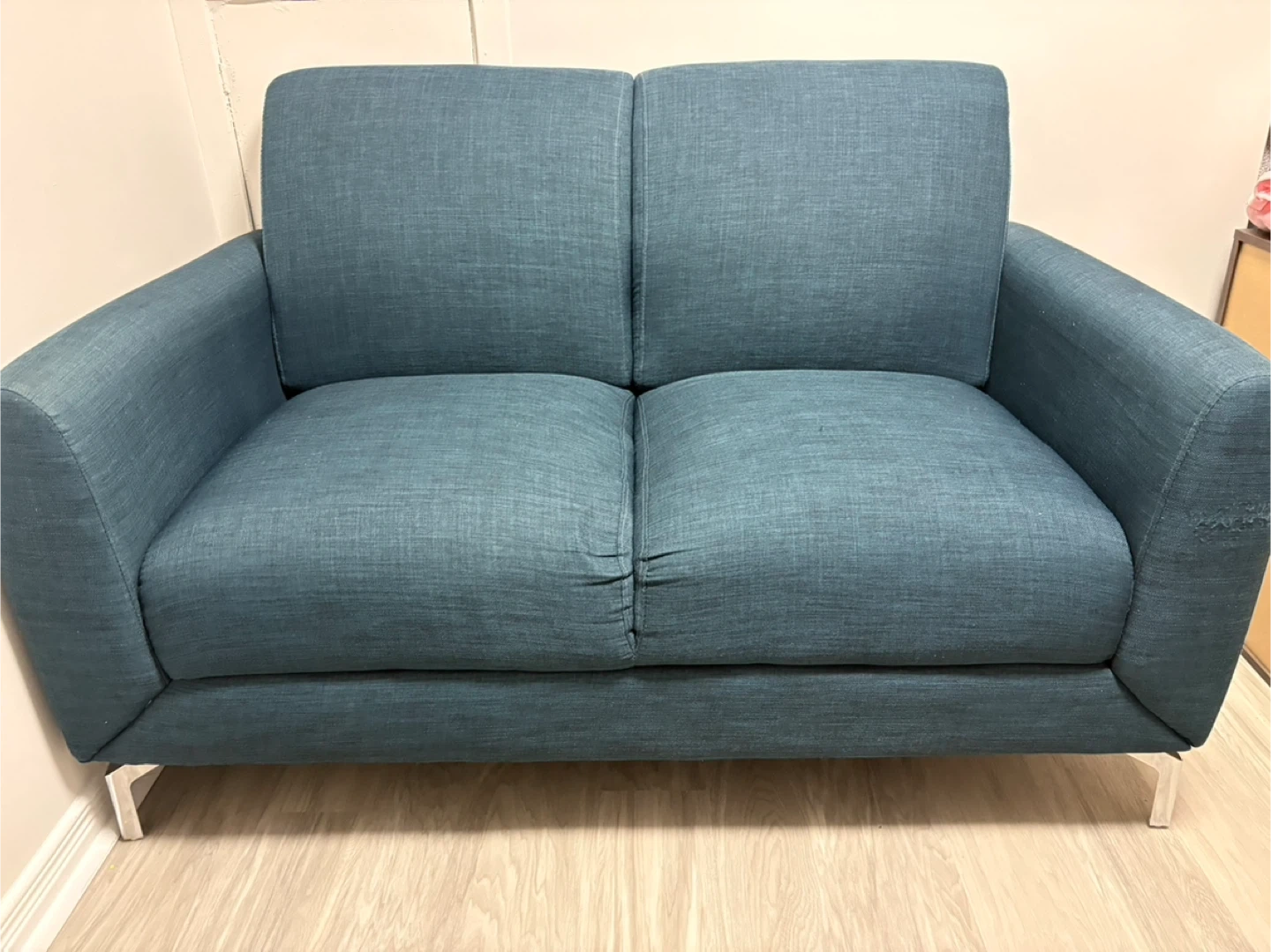 This two-seater sofa comes in a lovely blue hue. It's upholstered in a textured fabric with comfortable cushions. Its modern design includes sleek metal legs. A great addition for a smaller living space!