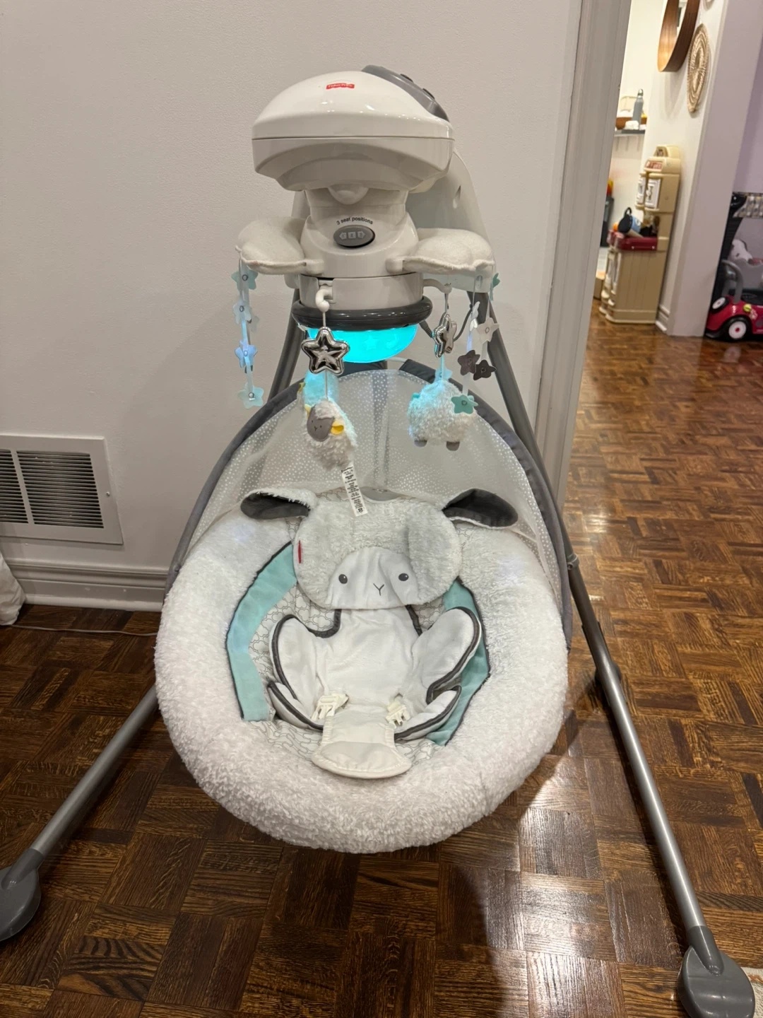 This Fisher-Price Deluxe Cradle Swing comes in a gentle lamb theme. It offers multiple swinging motions and soothing sounds. Perfect for keeping your little one comfy and entertained!