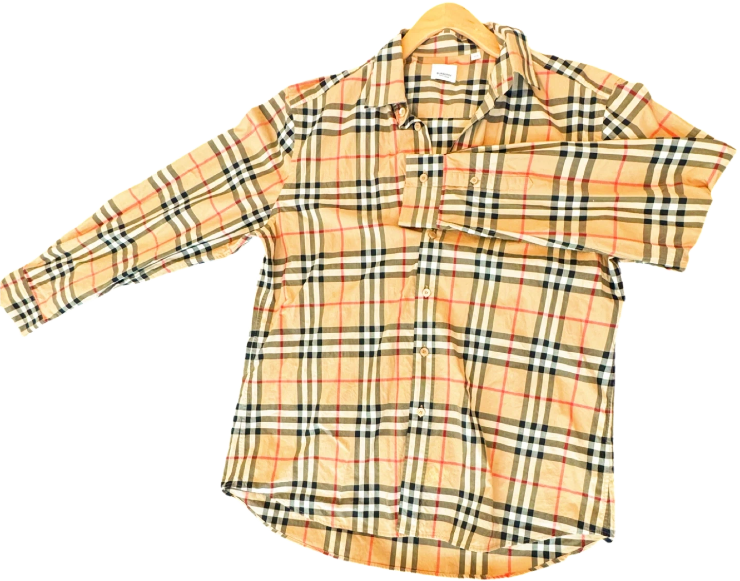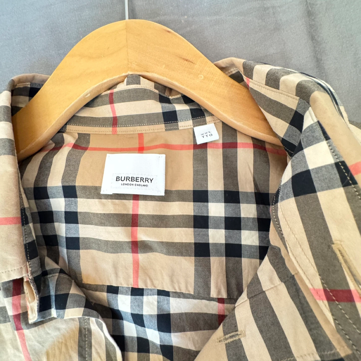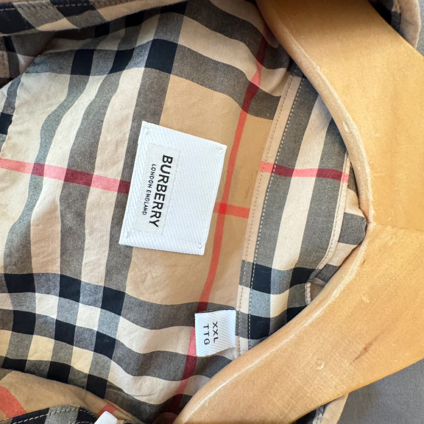This is a classic Burberry long-sleeve shirt featuring the iconic check pattern. It's made from 100% cotton. Includes extra buttons attached to a tag. Size is XXL.