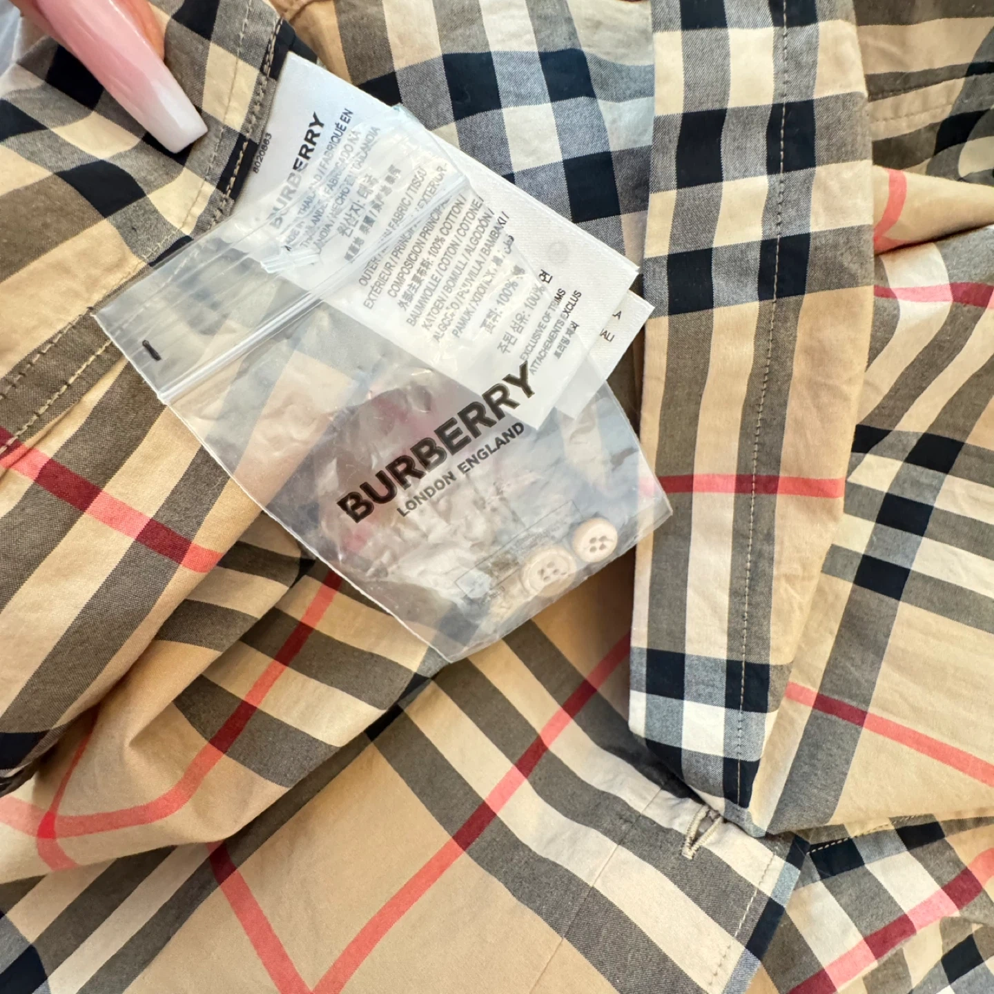 This is a classic Burberry long-sleeve shirt featuring the iconic check pattern. It's made from 100% cotton. Includes extra buttons attached to a tag. Size is XXL.