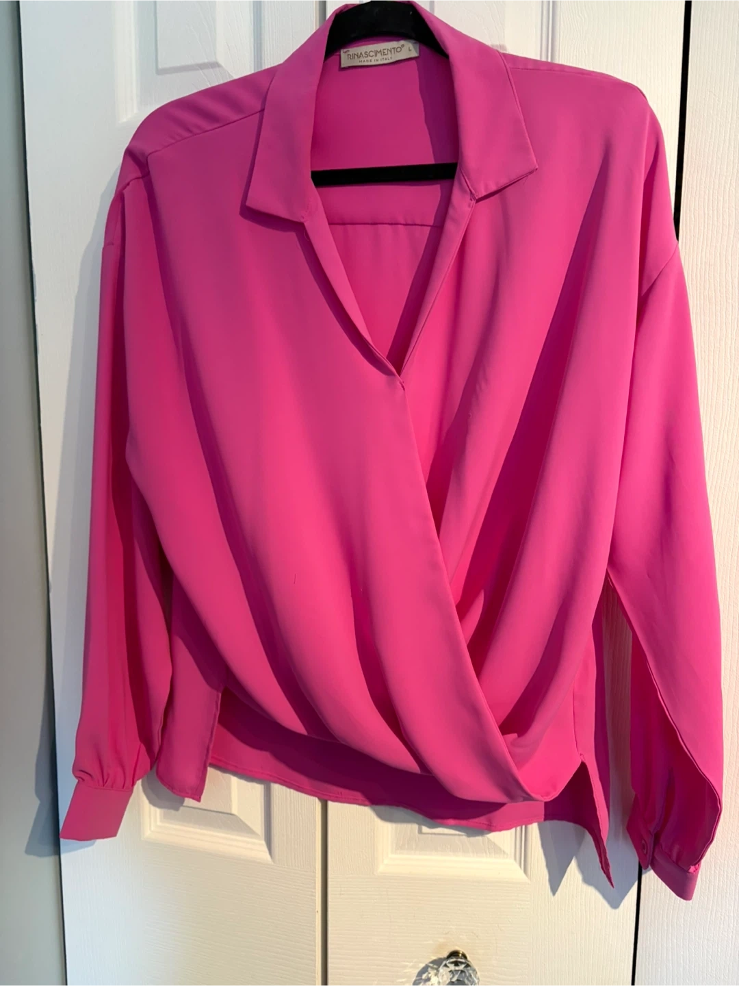 This stylish Rinascimento blouse comes in a vibrant pink colour. It's made in Italy and features a flattering wrap-style front. Size L.