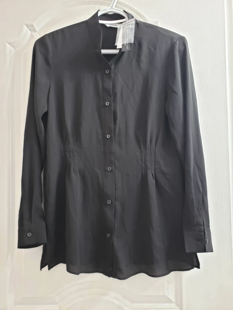 This is a black long-sleeve blouse. It features a button-up front and a mandarin collar. Machine washable material.