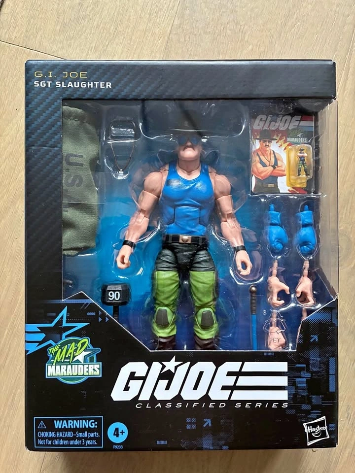 This is a G.I. Joe Classified Series Mad Marauders Sgt. Slaughter action figure, number #129. It's a 6-inch scale figure in his Mad Marauders design. Includes accessories like a campaign hat, sunglasses, boxing gloves, and a baton. Released in 2024.