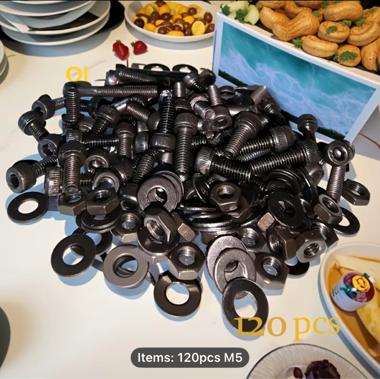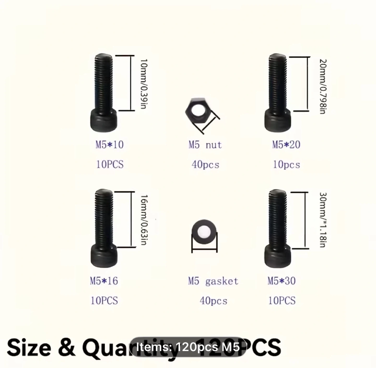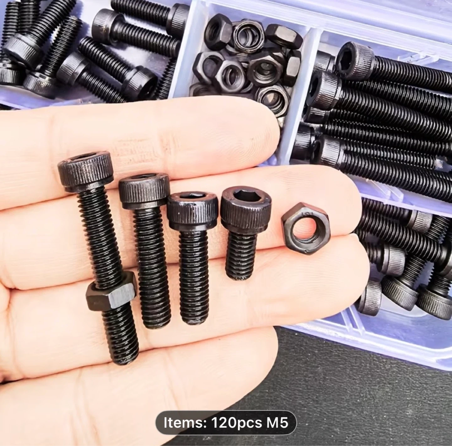 A Set of 120 Black Hex Screws And Nut Washers, M5 Size