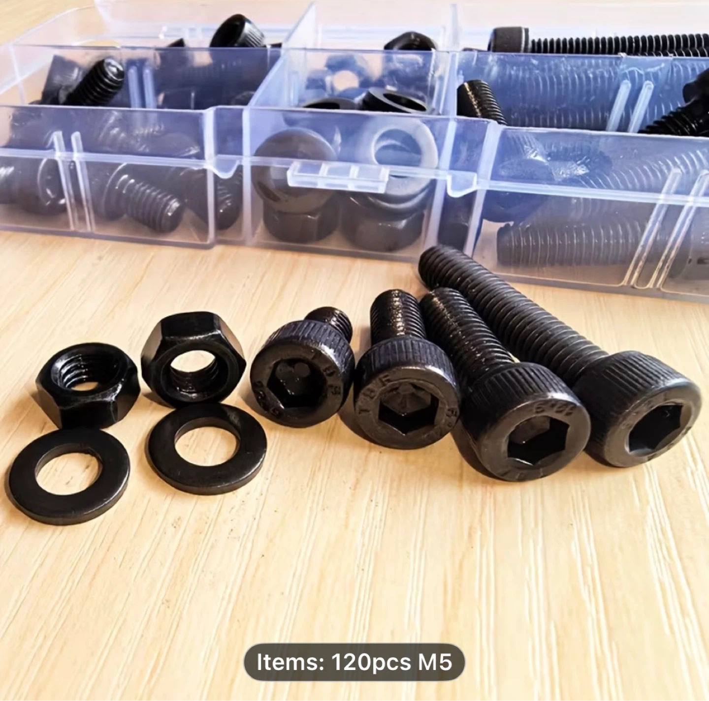 A Set of 120 Black Hex Screws And Nut Washers, M5 Size Includes Combinations of Different Lengths, Made of Grade 12.9 High-Strength , Featuring Cylindrical Head Hex Bolts And Cup Head Bolts
