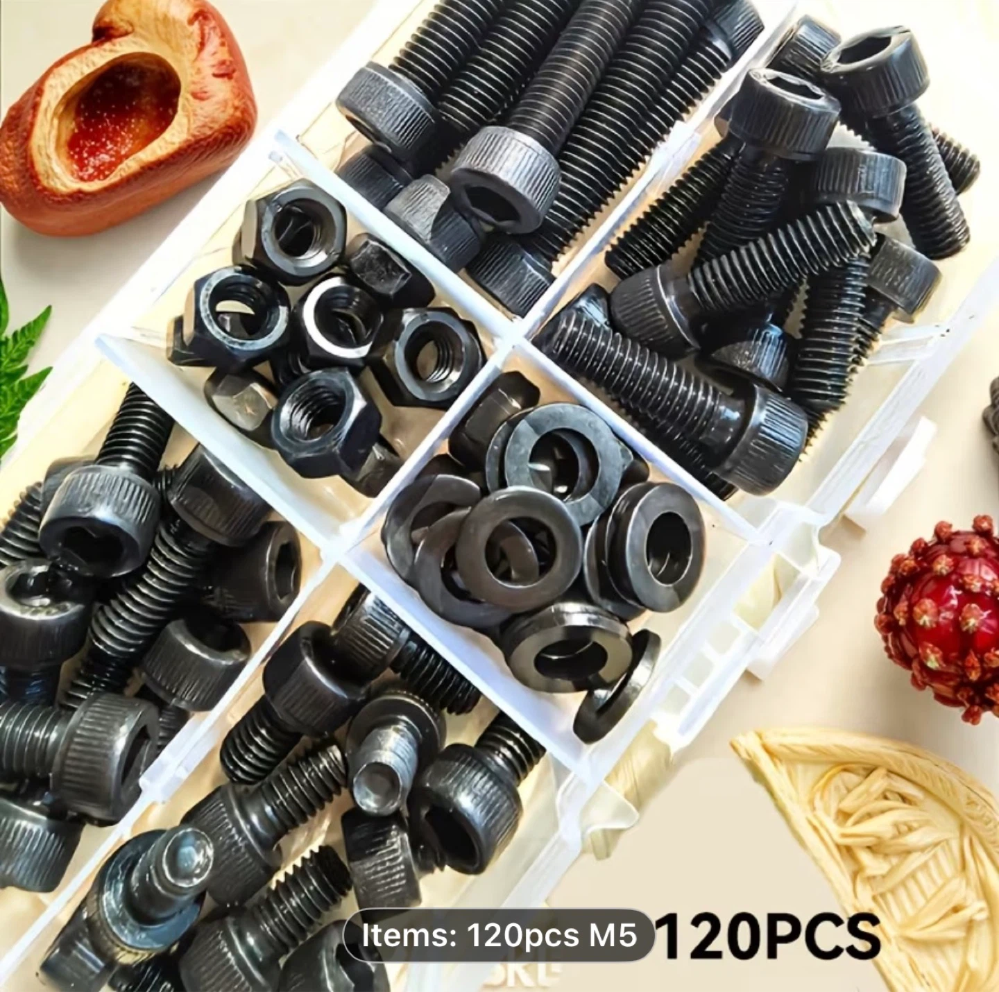 A Set of 120 Black Hex Screws And Nut Washers, M5 Size