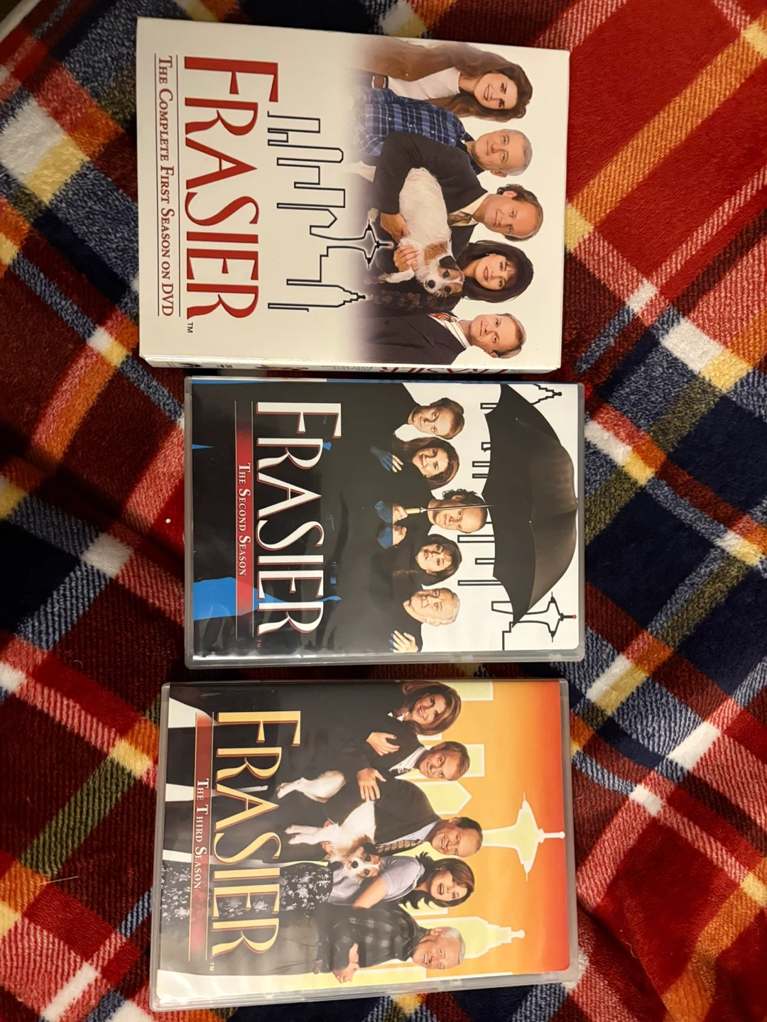 This DVD set includes The Complete First Season, The Second Season, and The Third Season of the TV show Frasier. Each season is on its own DVD case. It's great for fans of the show who want to relive all the witty moments.