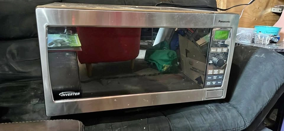 Handy Panasonic Inverter Genius microwave. Stainless steel finish. Has sensor cook, sensor reheat, turbo defrost, and keep warm features. Works well. Length-width-height in pictures. Needs a bit of a wipe down.