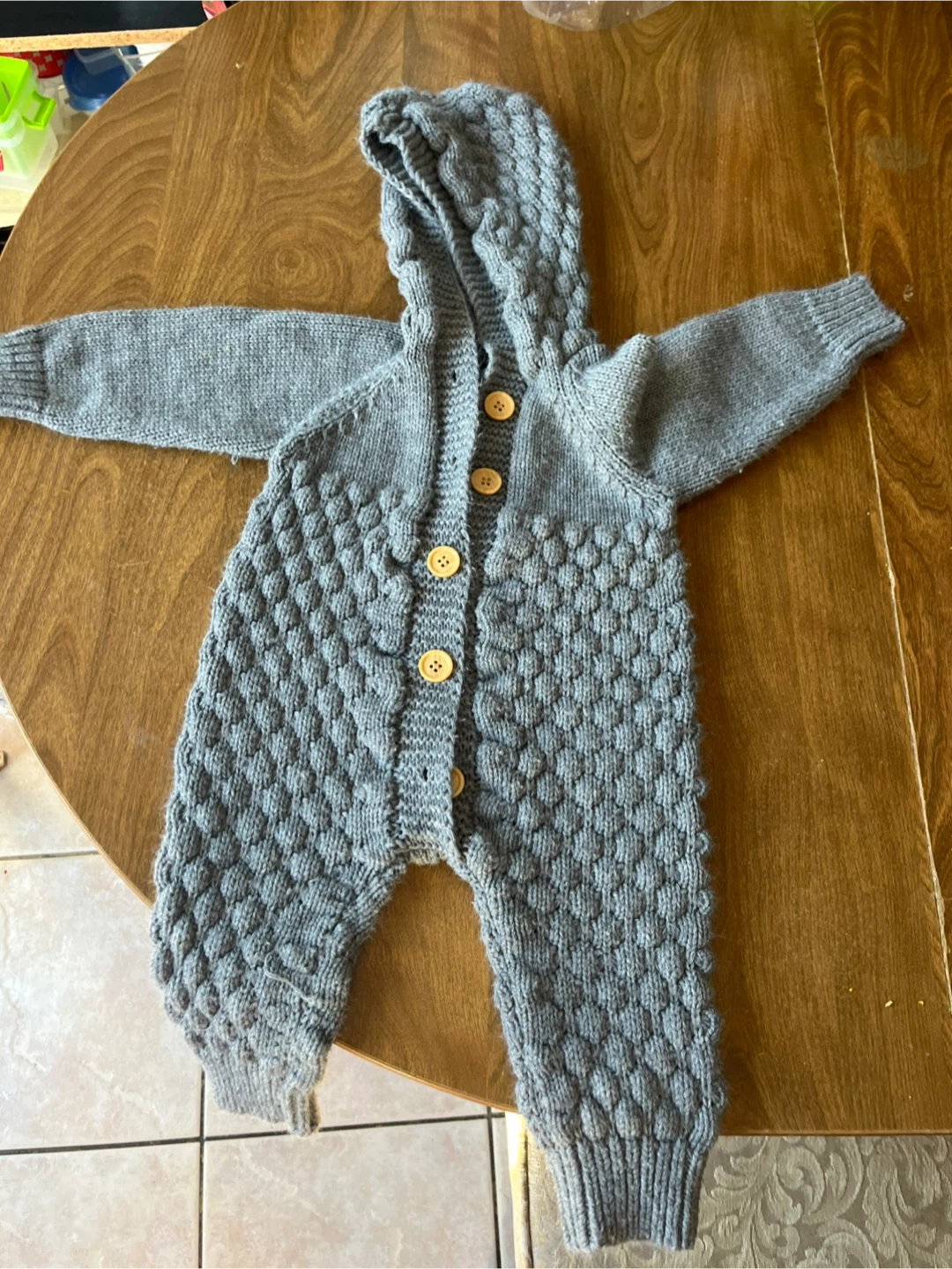 This grey knit bunting suit has a cozy hood and wooden button closures. It features a textured honeycomb pattern on the body and sleeves. This garment is perfect for keeping your little one warm and stylish. Bought in amazon for 25$ . Used only 4 times. Perfect for winter