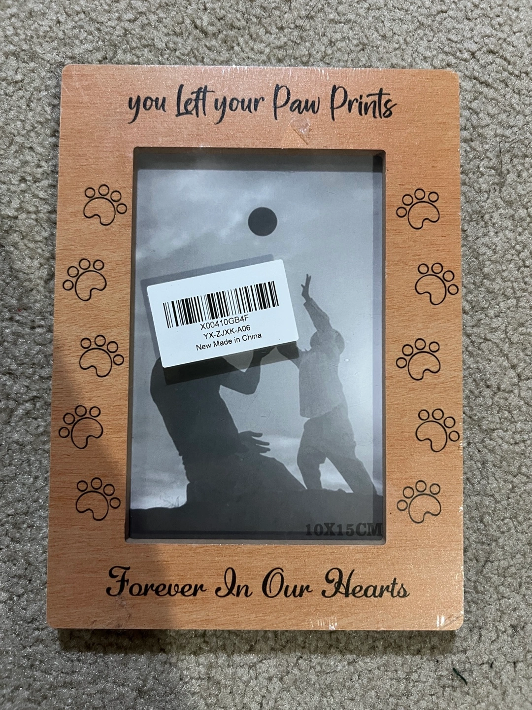 A cute picture frame with paw prints, perfect for displaying your favourite pet photos! The frame says, "you Left your Paw Prints Forever In Our Hearts" and fits a 10x15cm photo.
