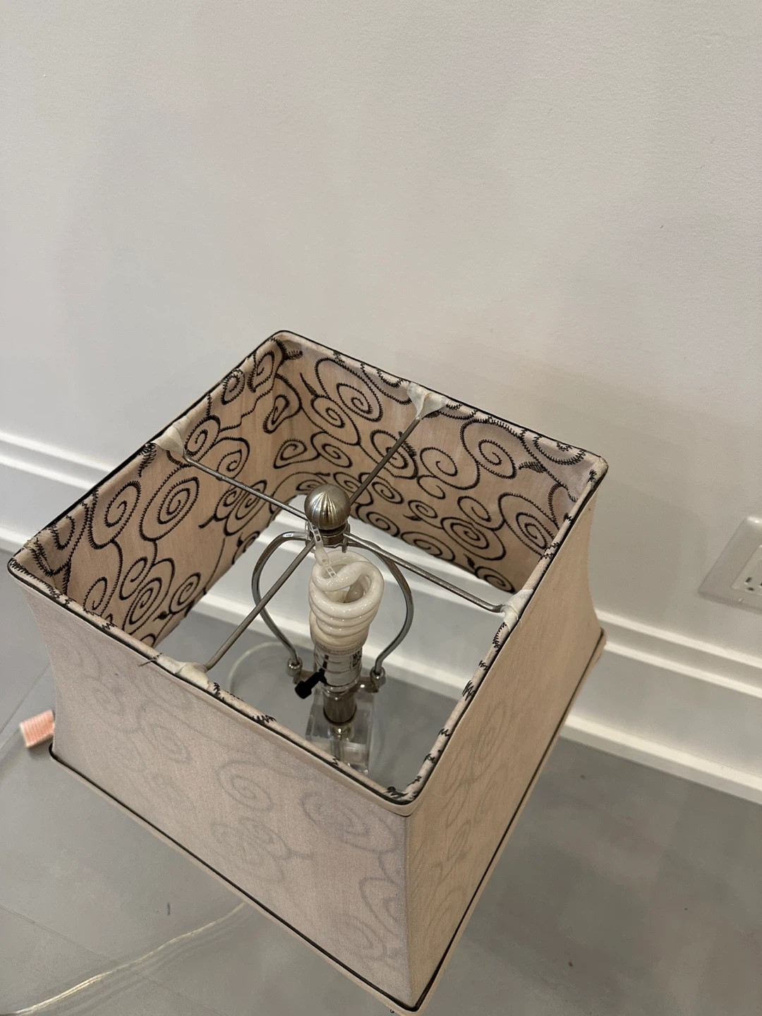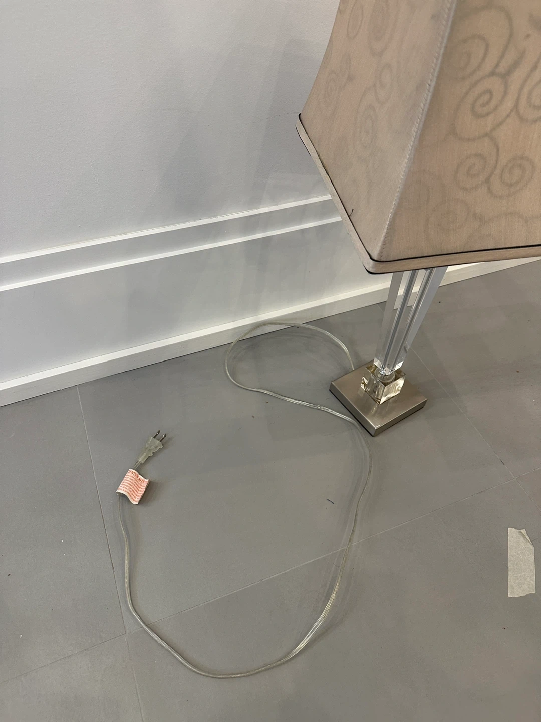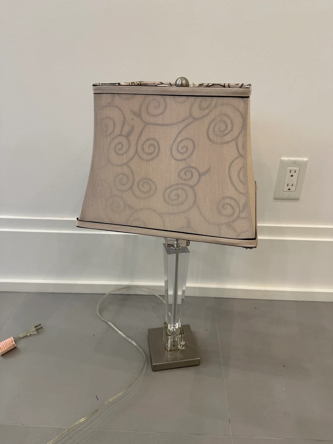 A stylish table lamp featuring a square fabric shade with a subtle swirl pattern. It has a clear acrylic column and a brushed nickel base. Comes with a fluorescent bulb included.