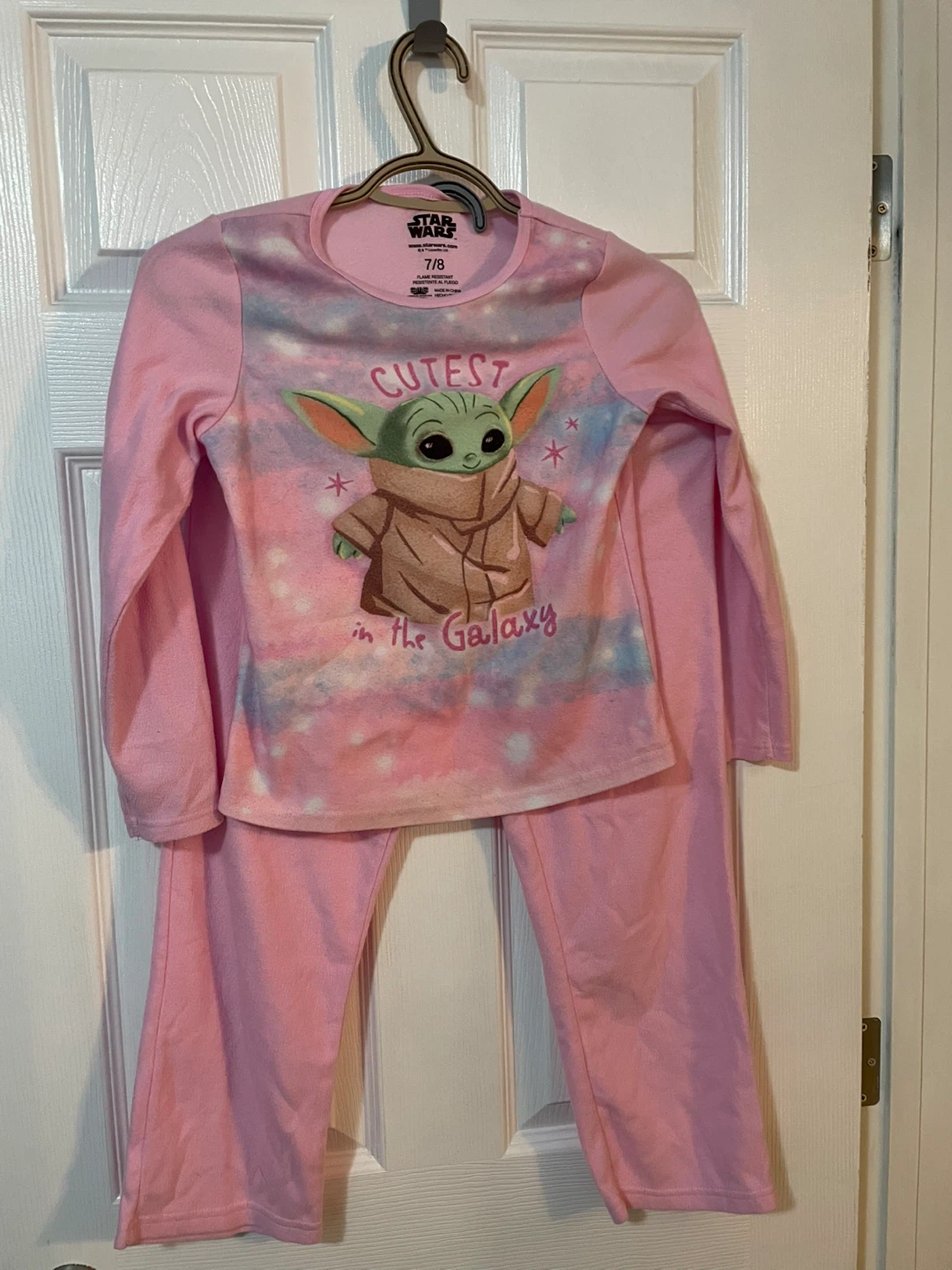 These adorable Star Wars pajamas feature Baby Yoda! They are a size 7/8 and in great condition. Perfect for any young Star Wars fan!