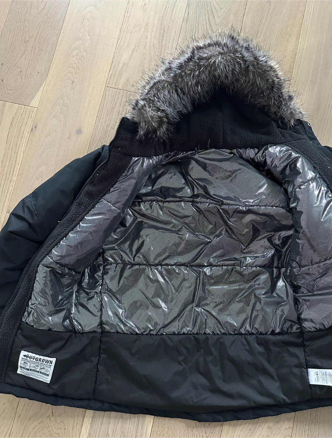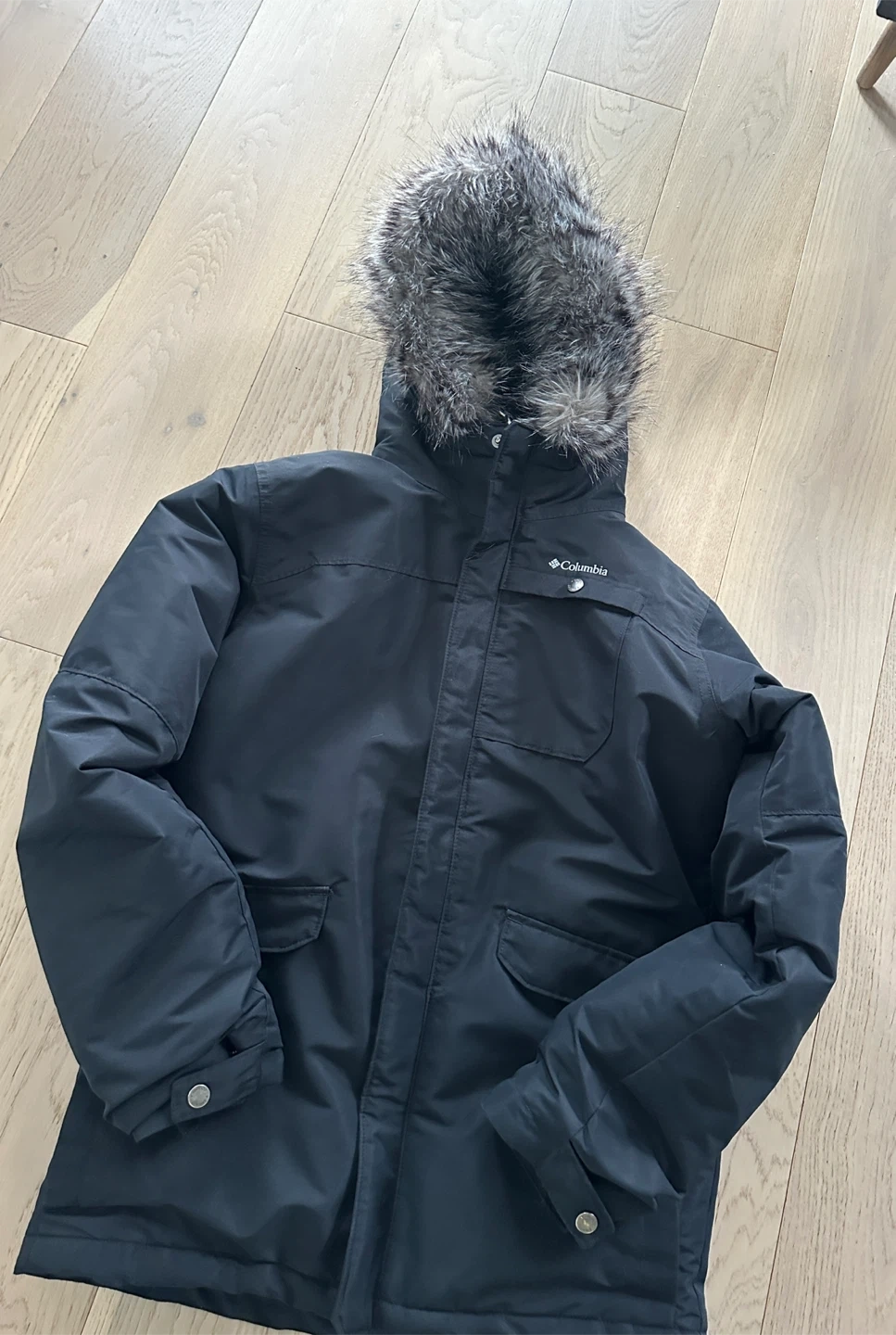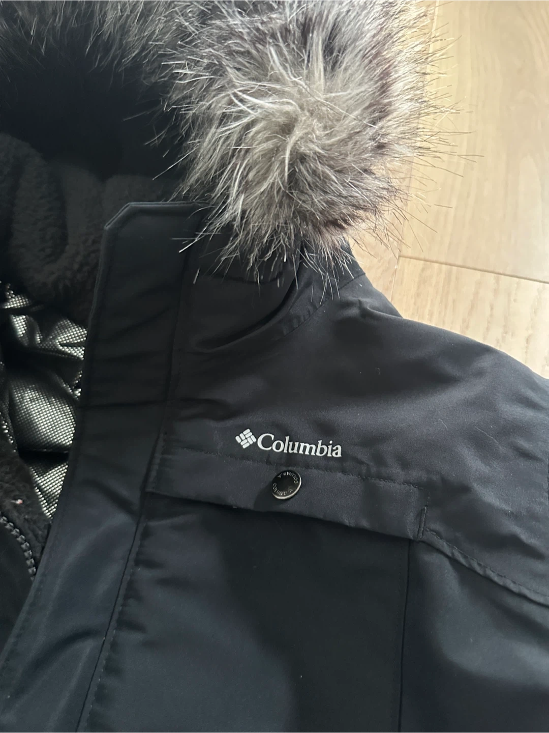 Columbia black winter parka jacket. It's insulated with a faux fur lined hood. Plenty of pockets for storage. It's a great jacket for staying warm in the cold!sizeM