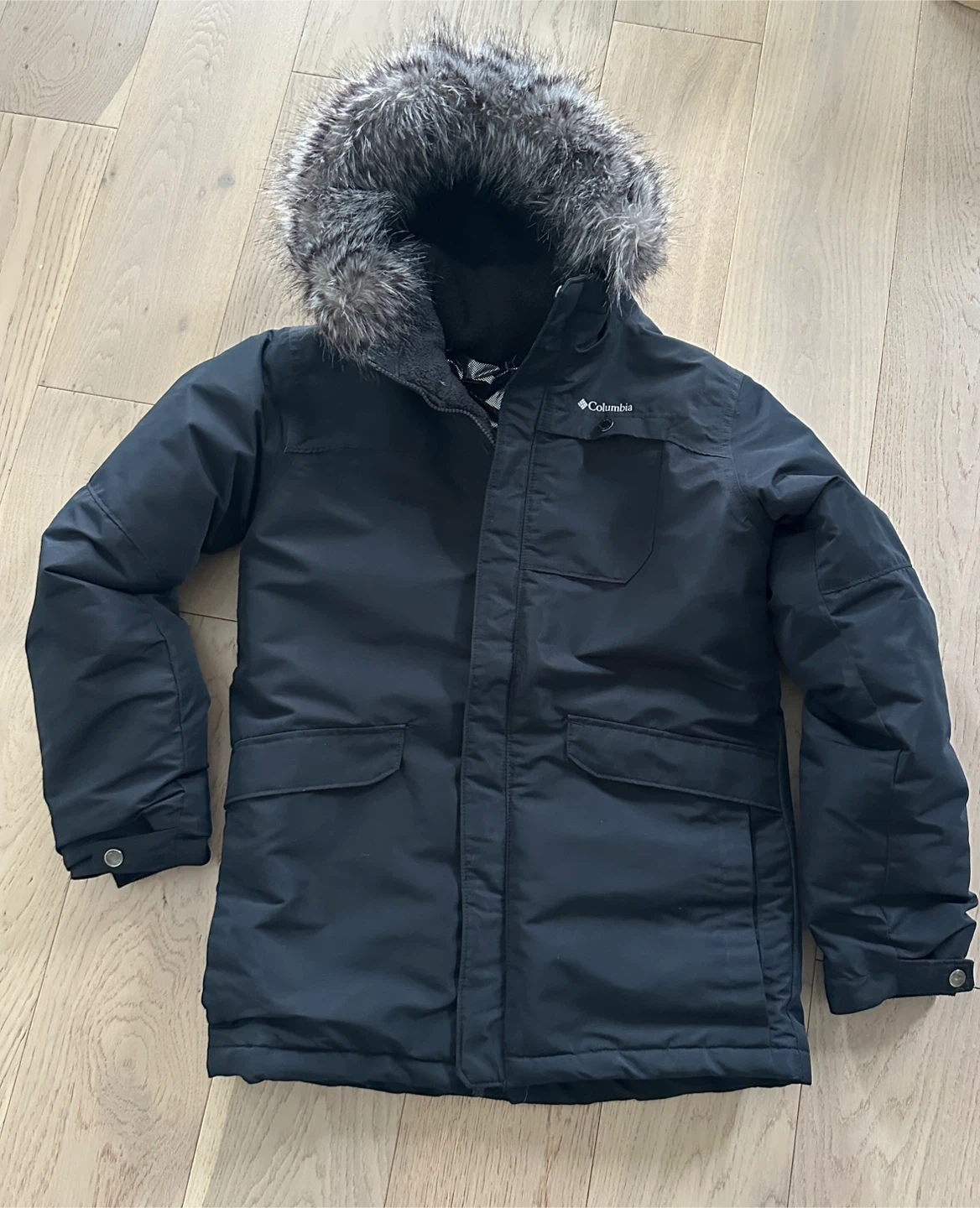 Columbia black winter parka jacket. It's insulated with a faux fur lined hood. Plenty of pockets for storage. It's a great jacket for staying warm in the cold!sizeM