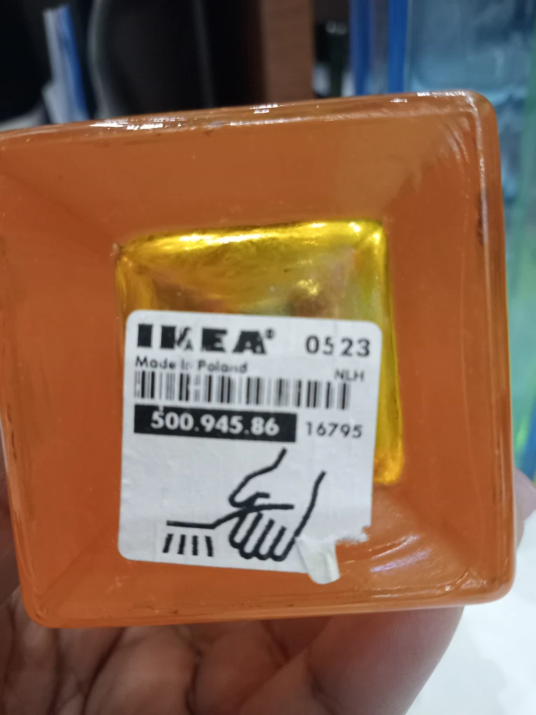 I'm selling an orange glass vase from Ikea. It's in great condition and ready to add a pop of colour to your home! The model number is 500.945.86. Made in Poland