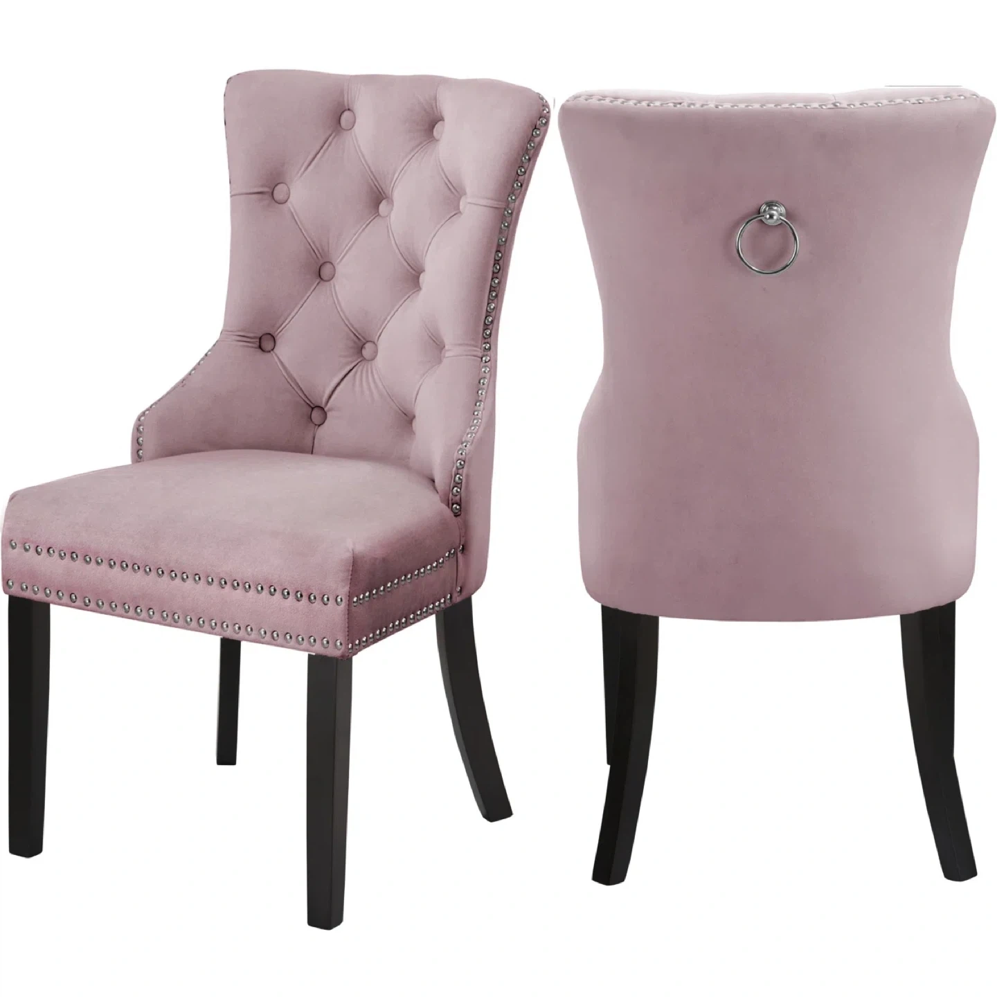 This is a beautiful pink velvet dining chair. It features a tufted back and nailhead trim, adding a touch of elegance to any dining space. The chair has dark wooden legs and a ring detail on the back. It's in great condition and ready to enhance your dining room or kitchen!