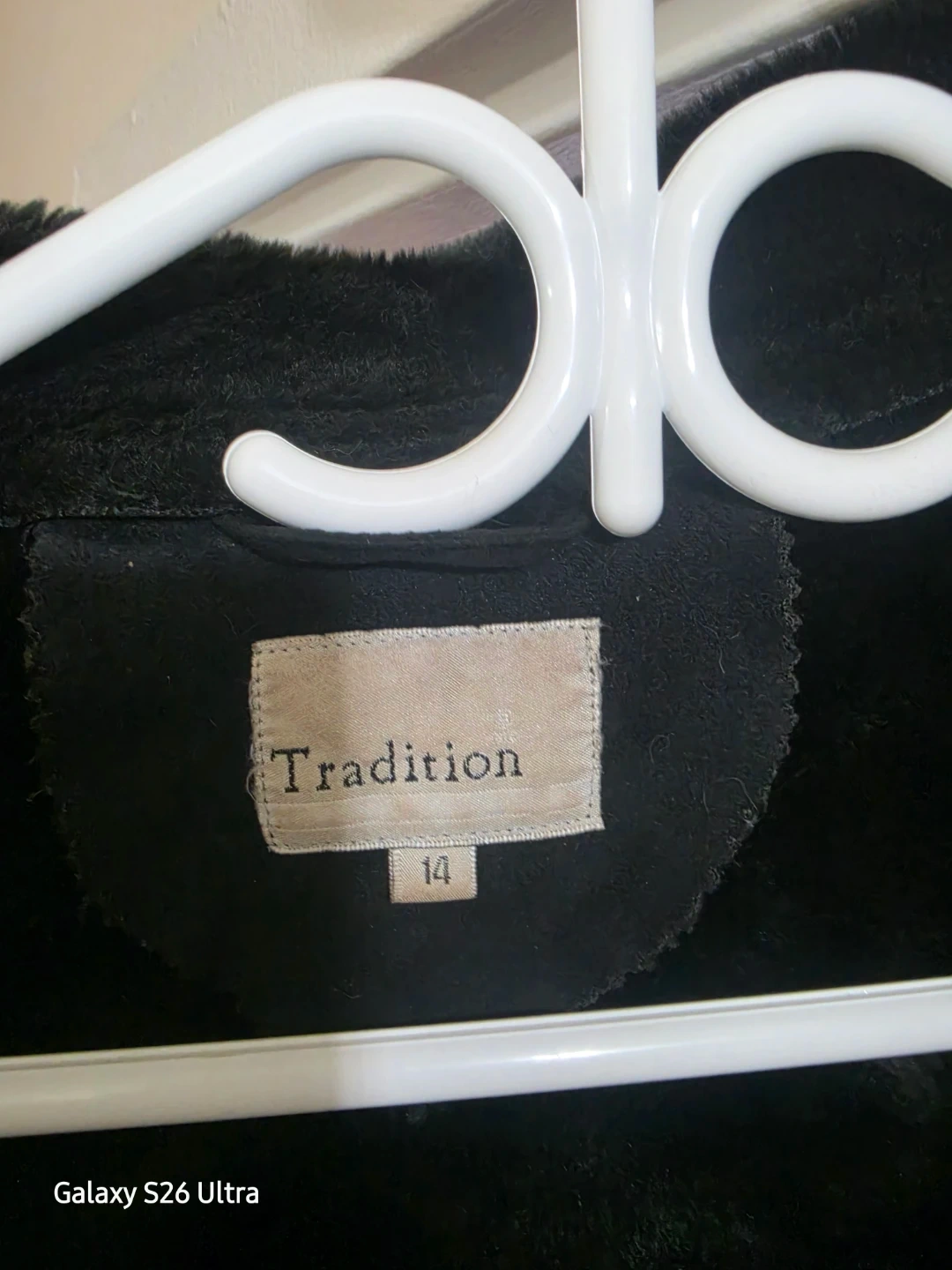 This black Tradition coat is a size 14. It's fully lined with faux fur for warmth. The coat features a classic button-up front. A great choice for cooler weather!