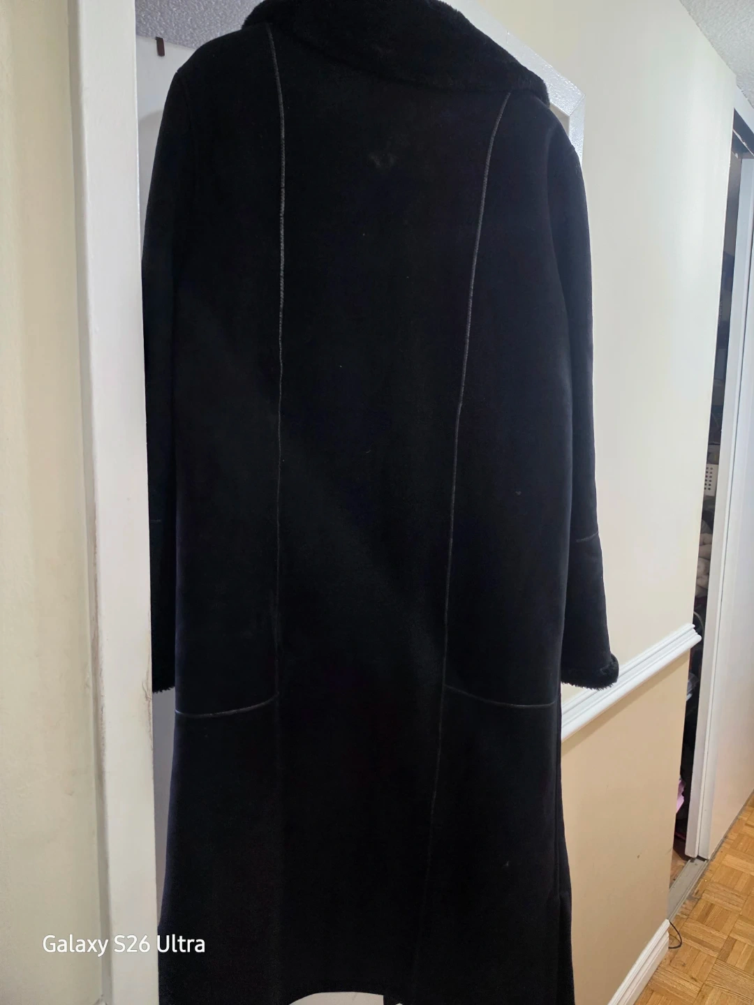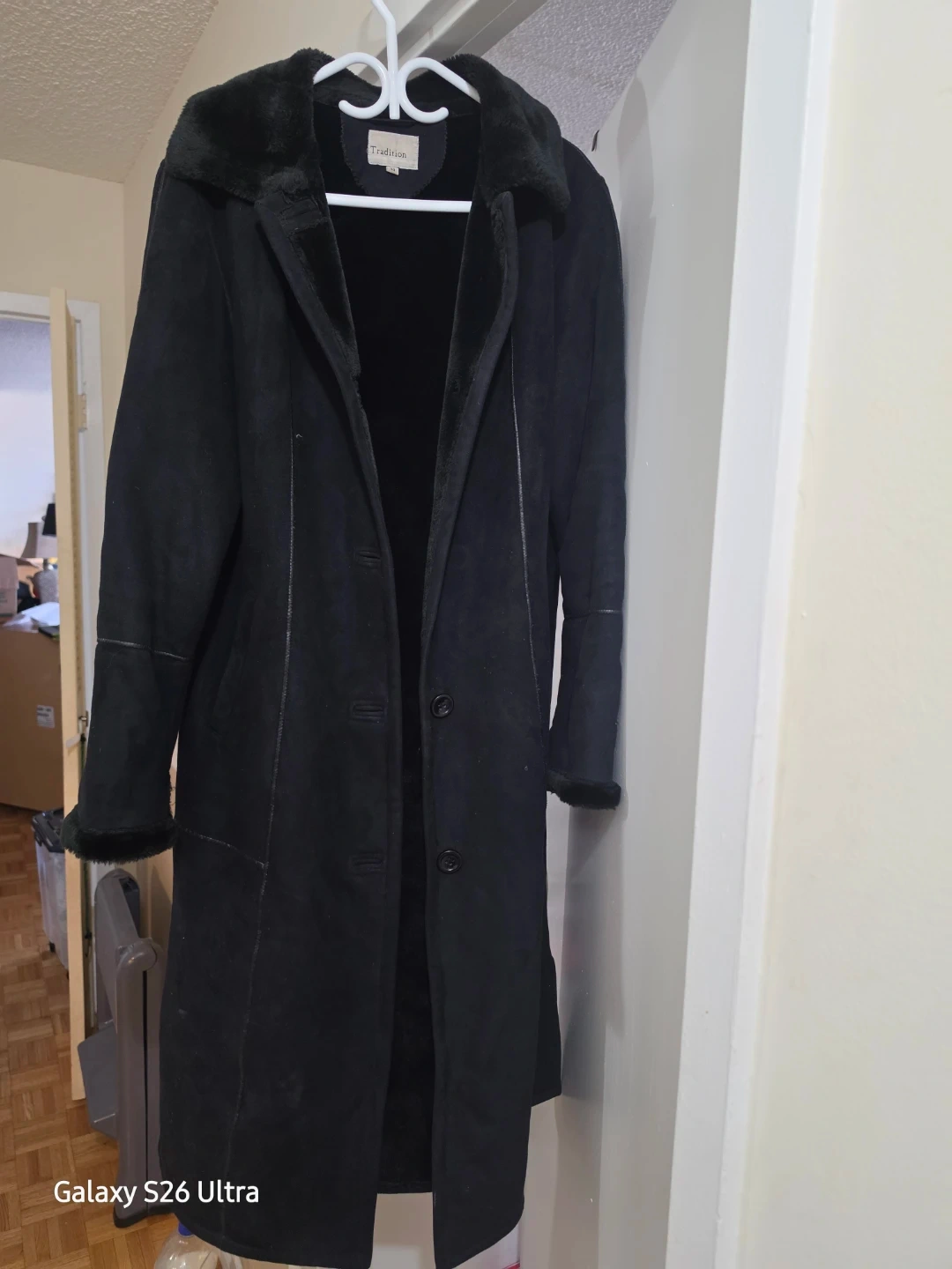 This black Tradition coat is a size 14. It's fully lined with faux fur for warmth. The coat features a classic button-up front. A great choice for cooler weather!