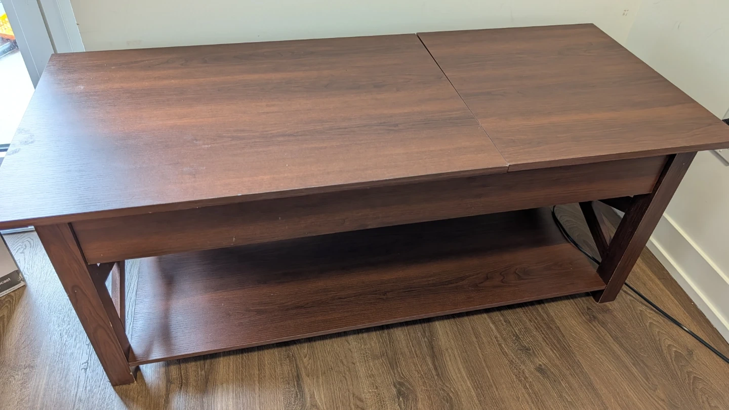 This lift-top table offers convenient storage with a hidden compartment. It's made of wood and features a lift-top mechanism for easy access. Provides extra surface space when lifted.