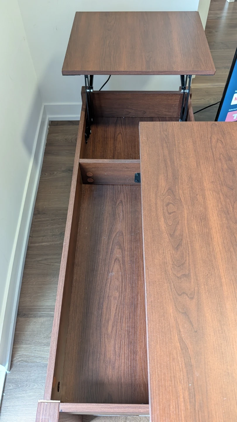 This lift-top table offers convenient storage with a hidden compartment. It's made of wood and features a lift-top mechanism for easy access. Provides extra surface space when lifted.