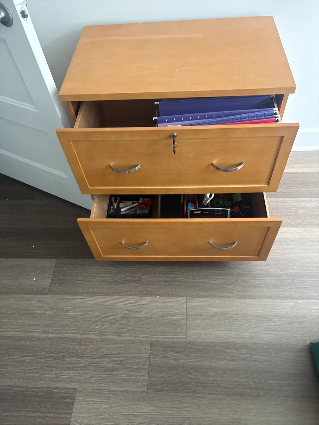 wooden filing cabinet with two drawers. It's perfect for organizing your files and office supplies. It has a light wood finish and simple, curved handles. Plus some office supplies