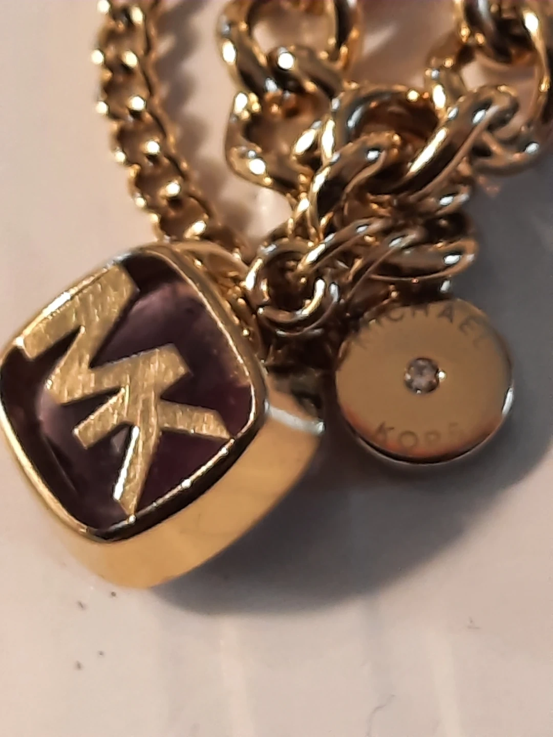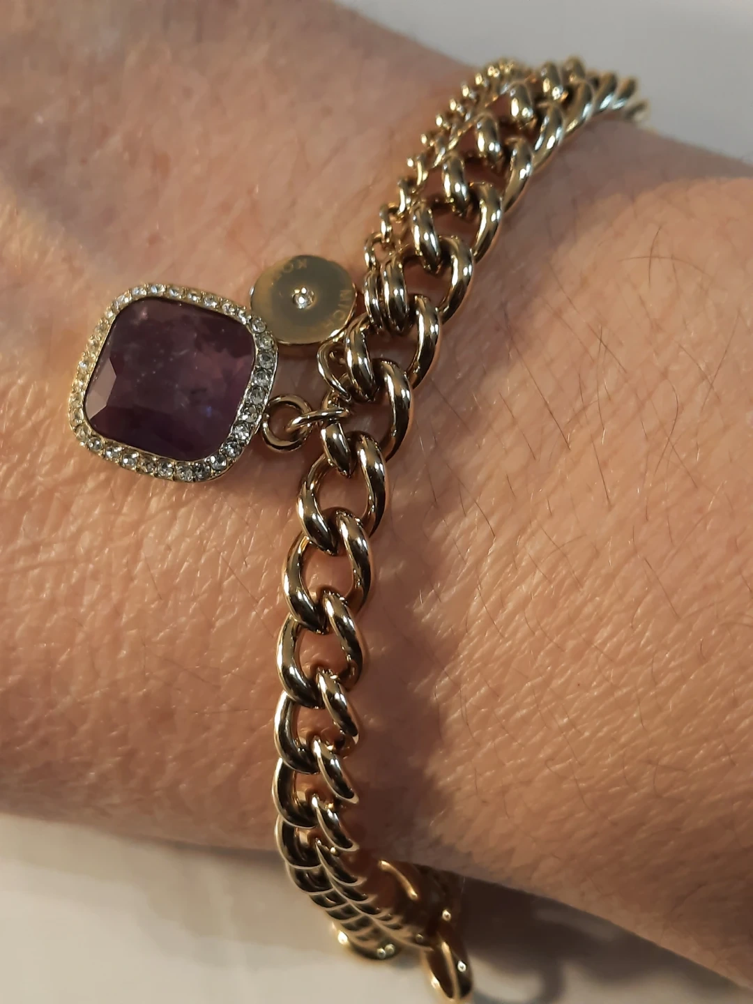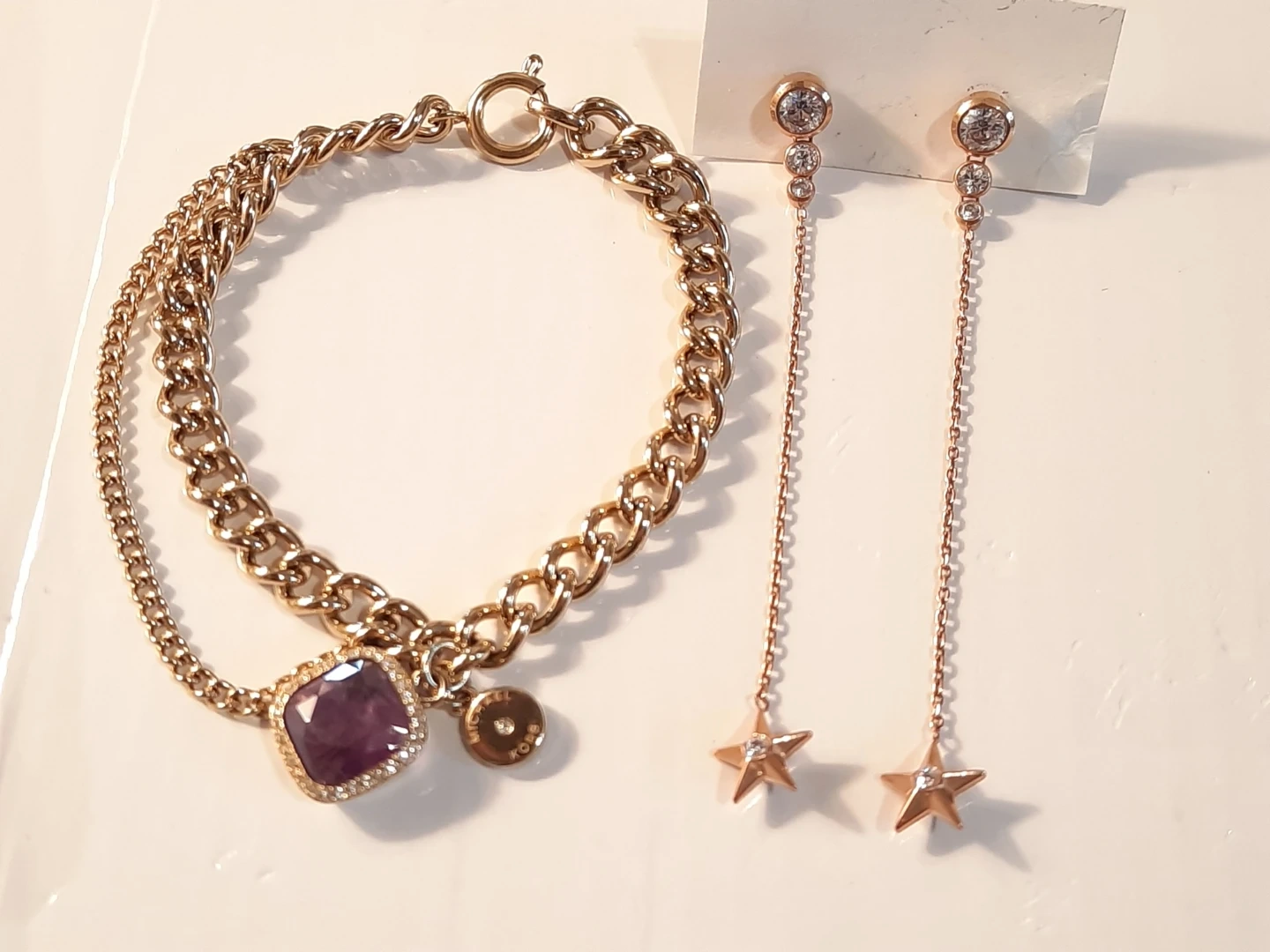 This Michael Kors set includes a rose gold tone chain bracelet with a purple gem amethist,charm and a matching pair of rose gold tone drop earrings featuring star details with cubic zirconia. It's a stylish accessory set.