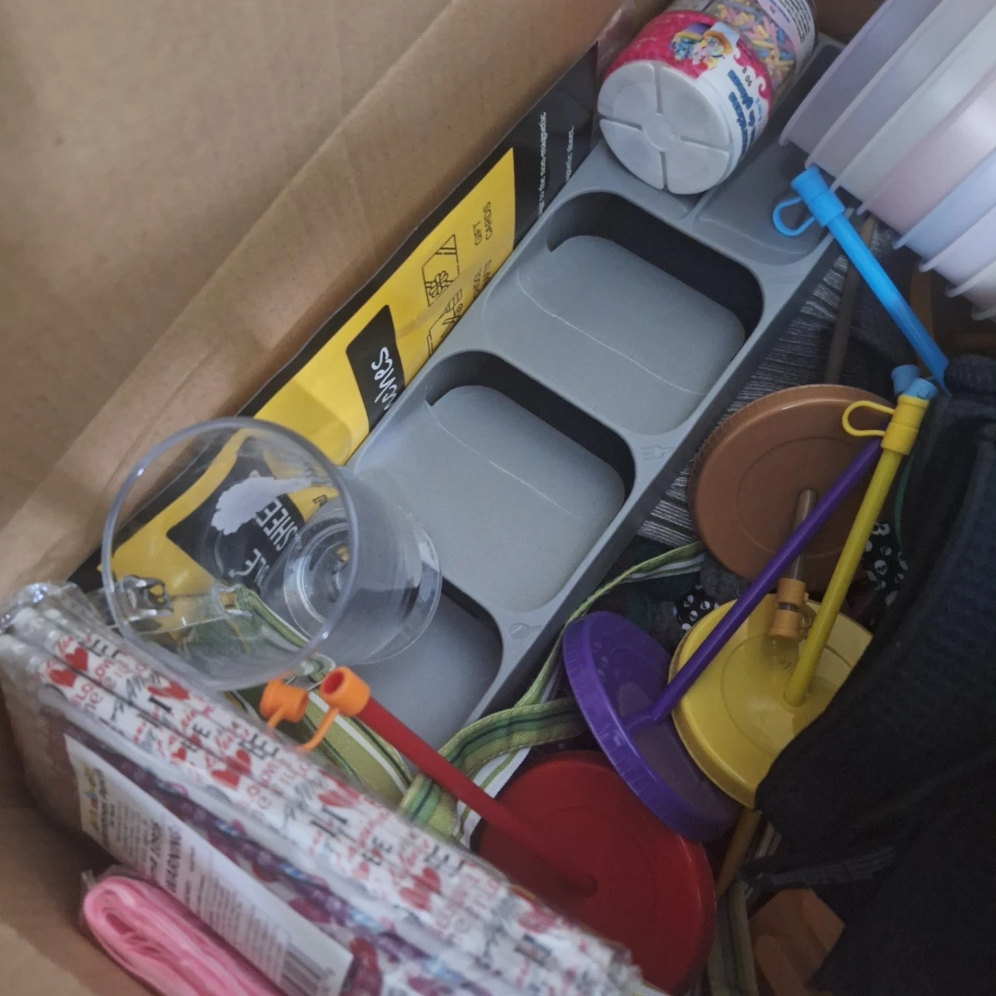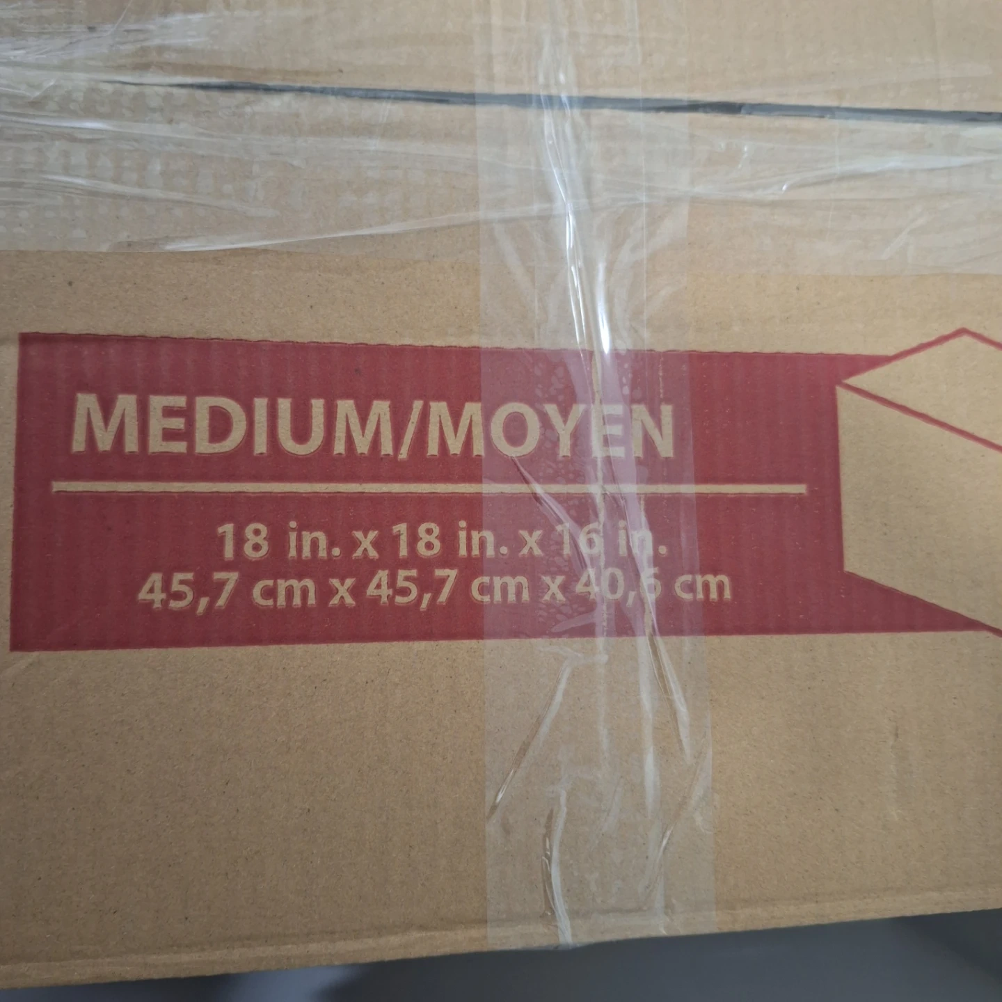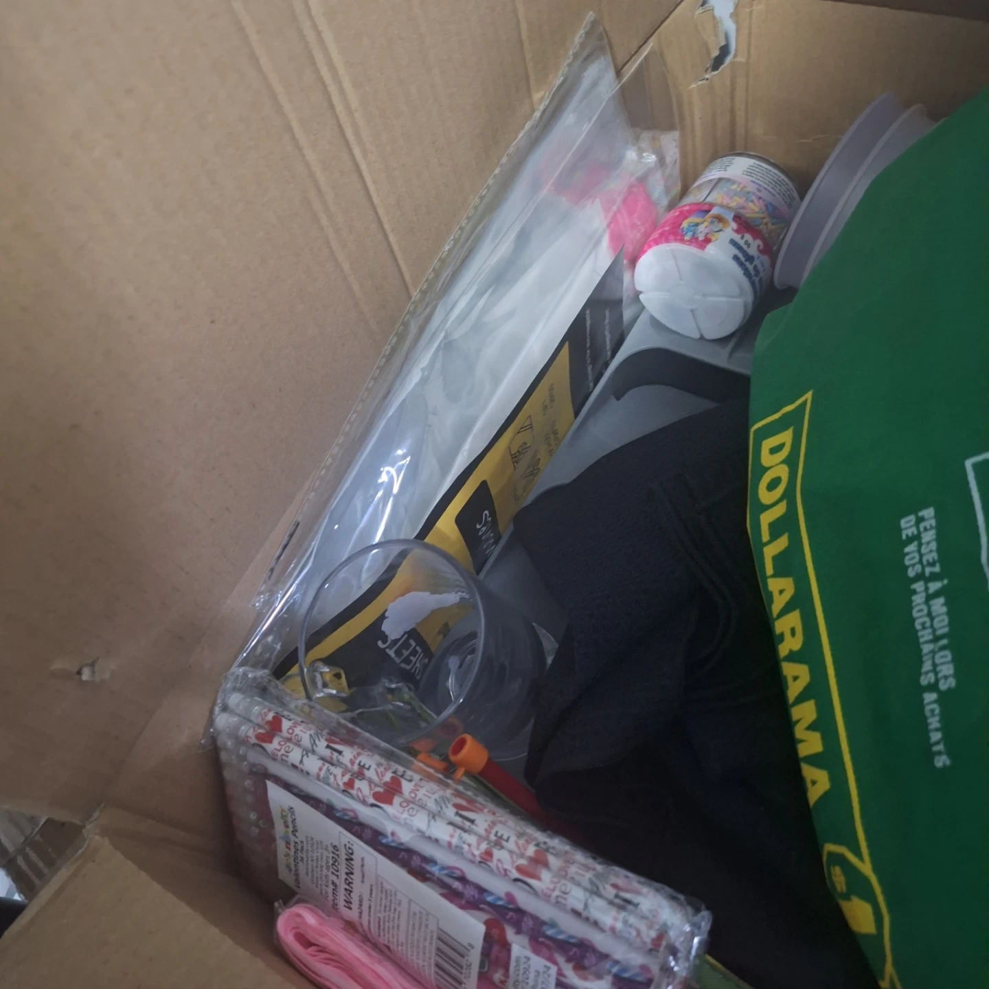 Assorted items found in a medium-sized box, including reusable shopping bags, party supplies, and household goods. Box dimensions are 18 in. x 18 in. x 16 in. (45.7 cm x 45.7 cm x 40.6 cm). Contents vary.