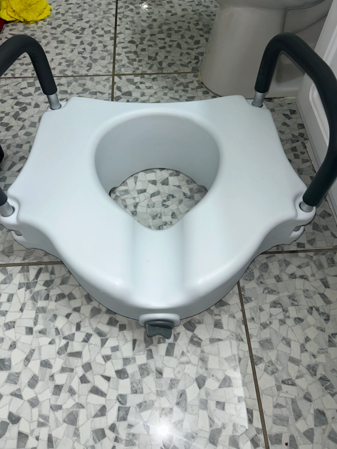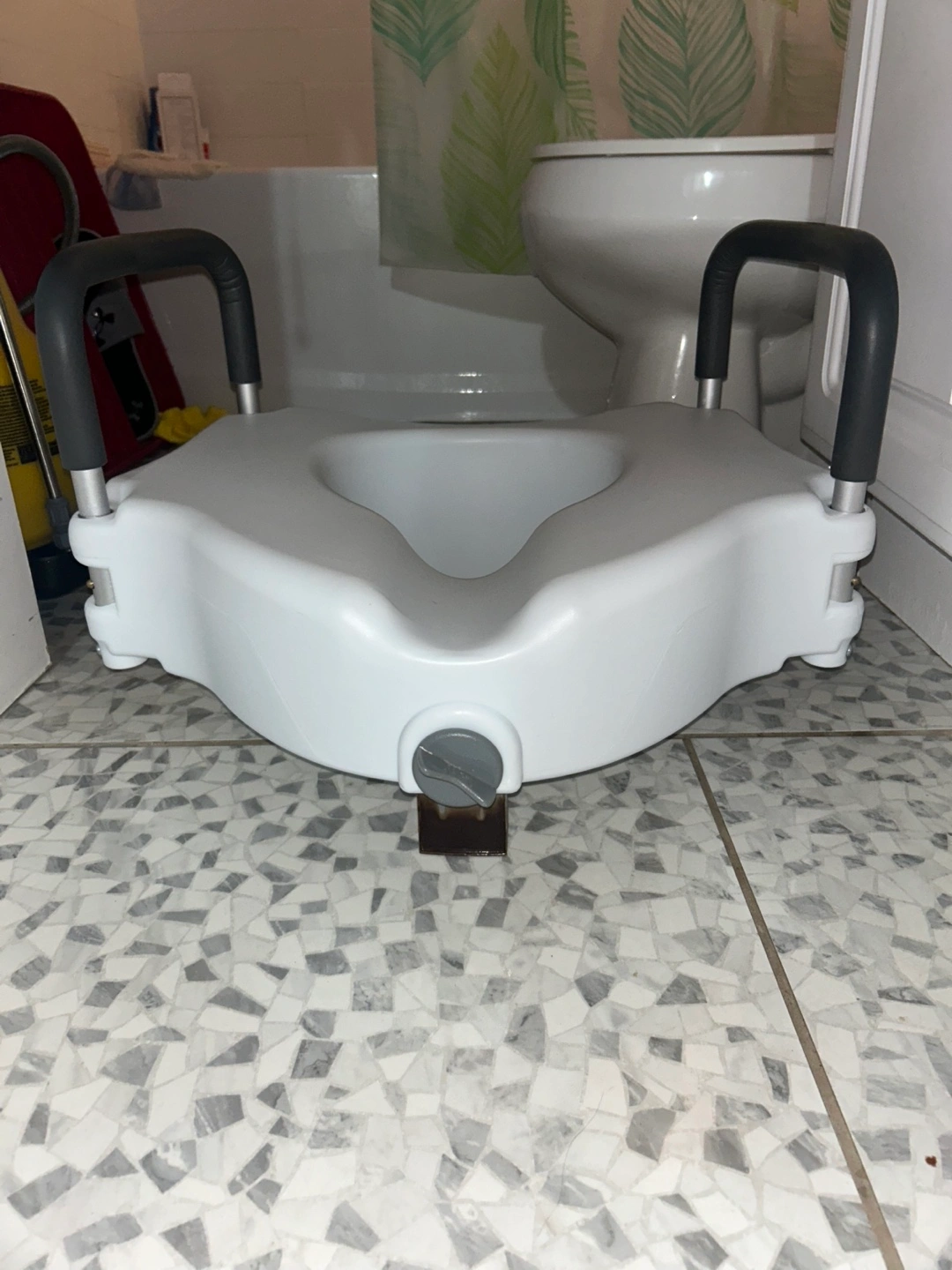 Toilet seat riser with armrests. Durable plastic construction. Easy to clean. Ideal for seniors, pregnant women, or those recovering from surgery.