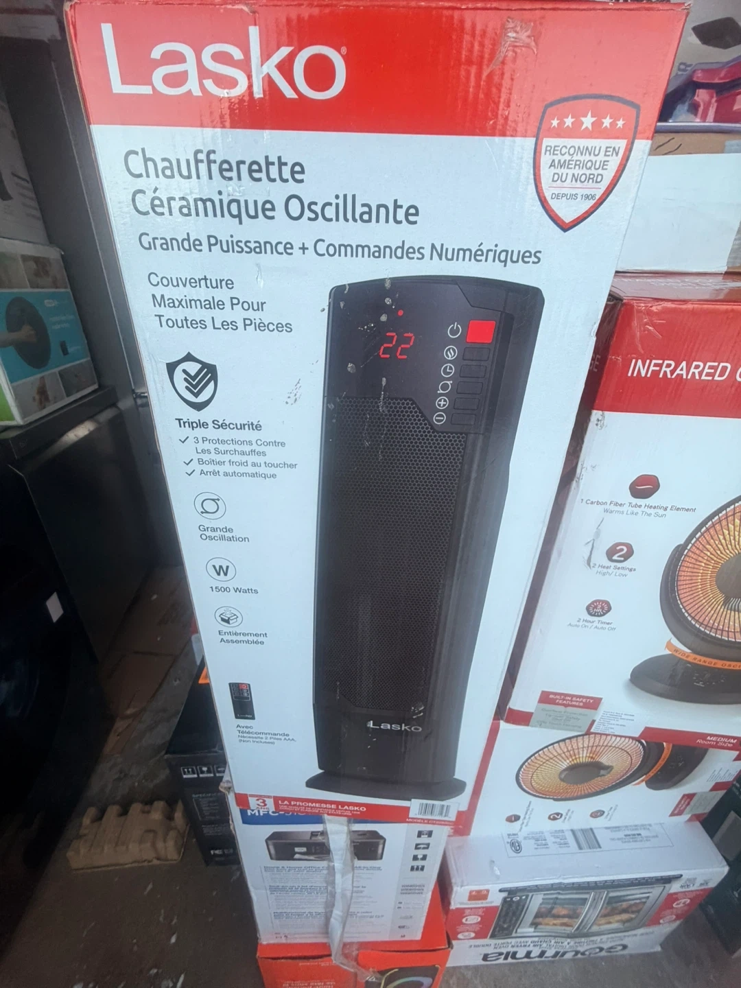 This Lasko oscillating ceramic heater offers great power and digital controls. It's 1500 Watts and includes a remote for convenience. Triple safety features like overheat protection and auto shut-off are built in.