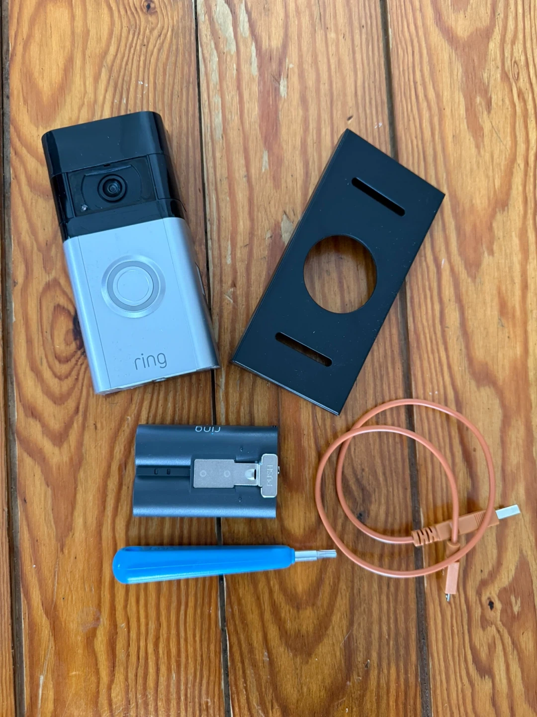 Comes with its mounting bracket, rechargeable battery pack, and charging cable. It also includes a small screwdriver for battery removal when charging.