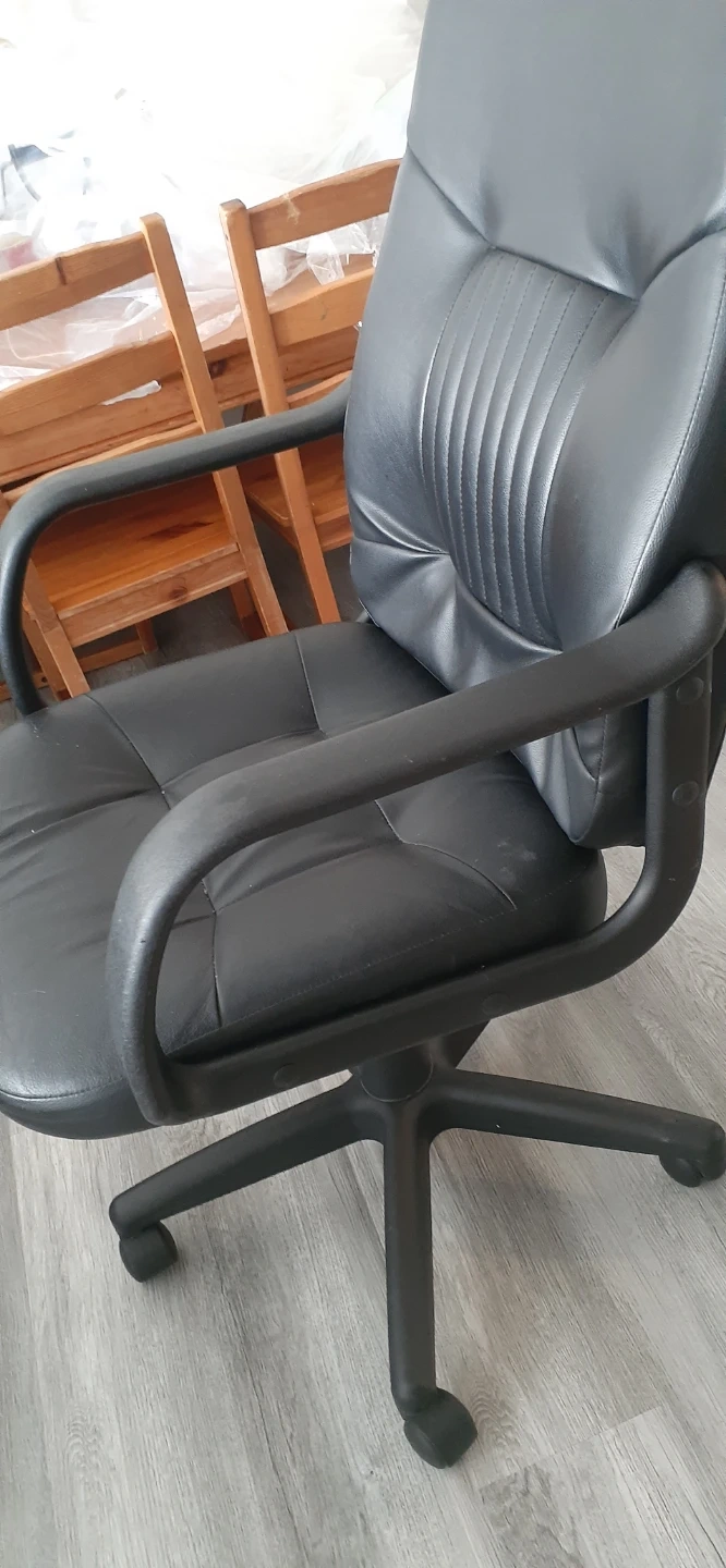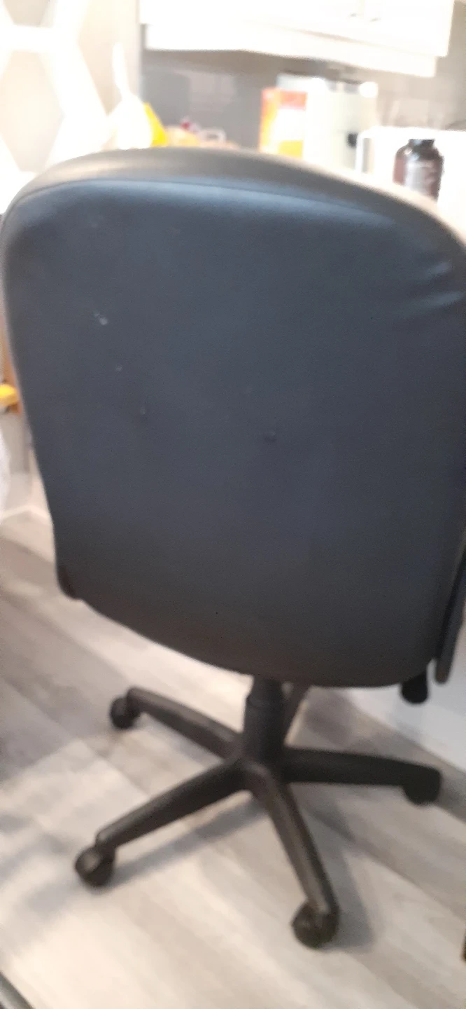 This is a black office chair. It's made of faux leather and has a sturdy base with wheels. Some minor wear is visible on the back.
