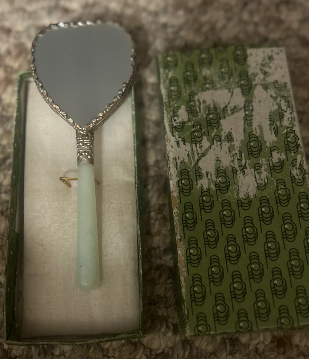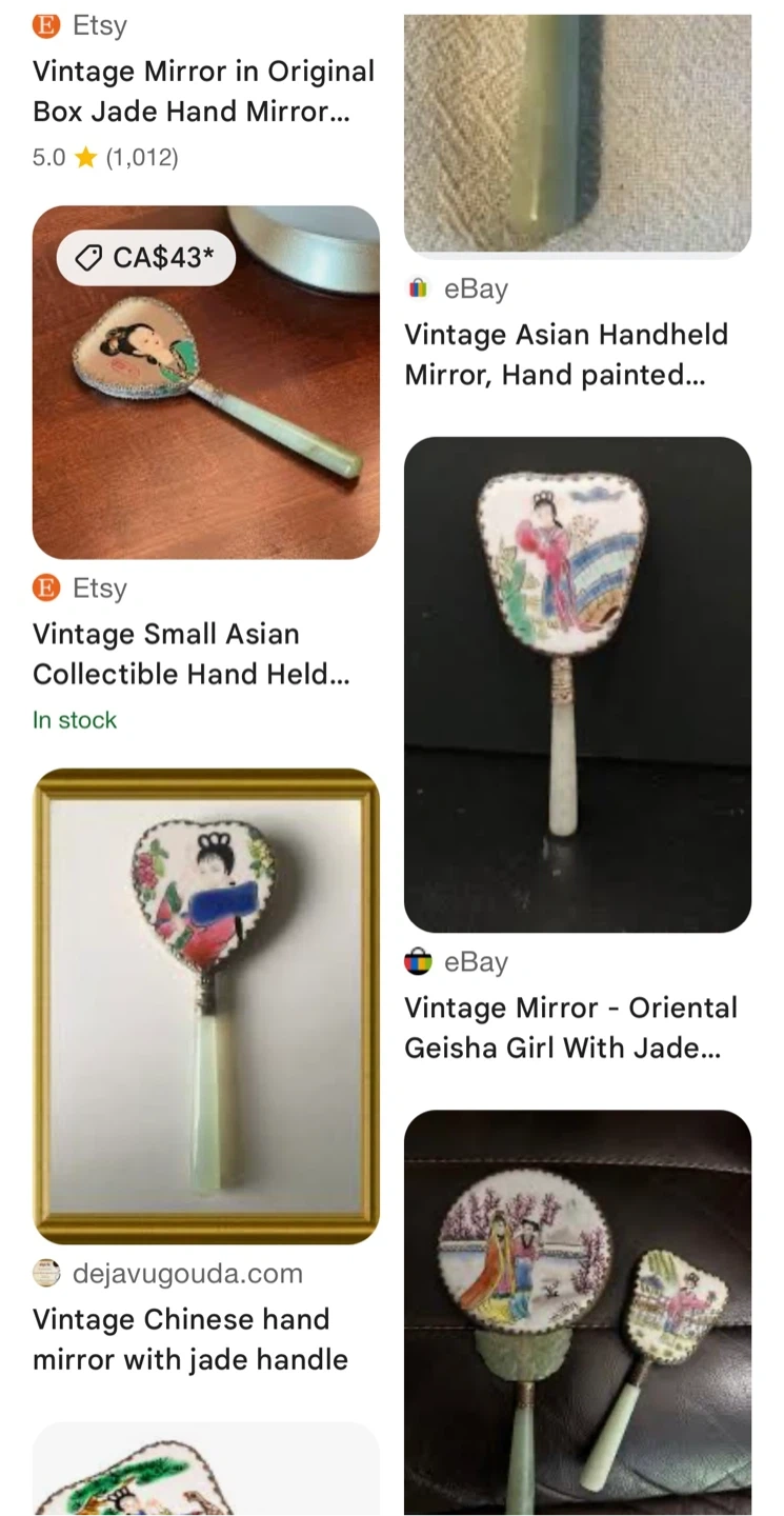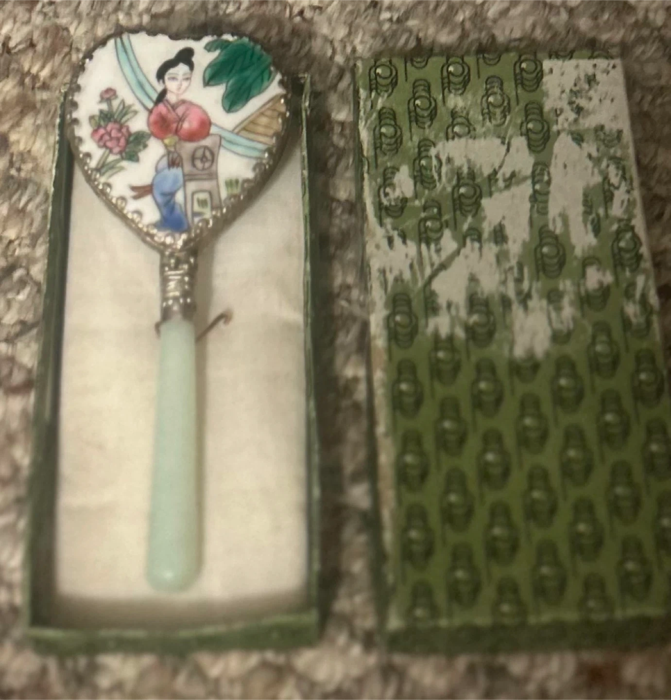 Selling a vintage Asian handheld mirror. It has a heart-shaped design with a hand-painted scene and a jade-coloured handle. Comes with its original box!