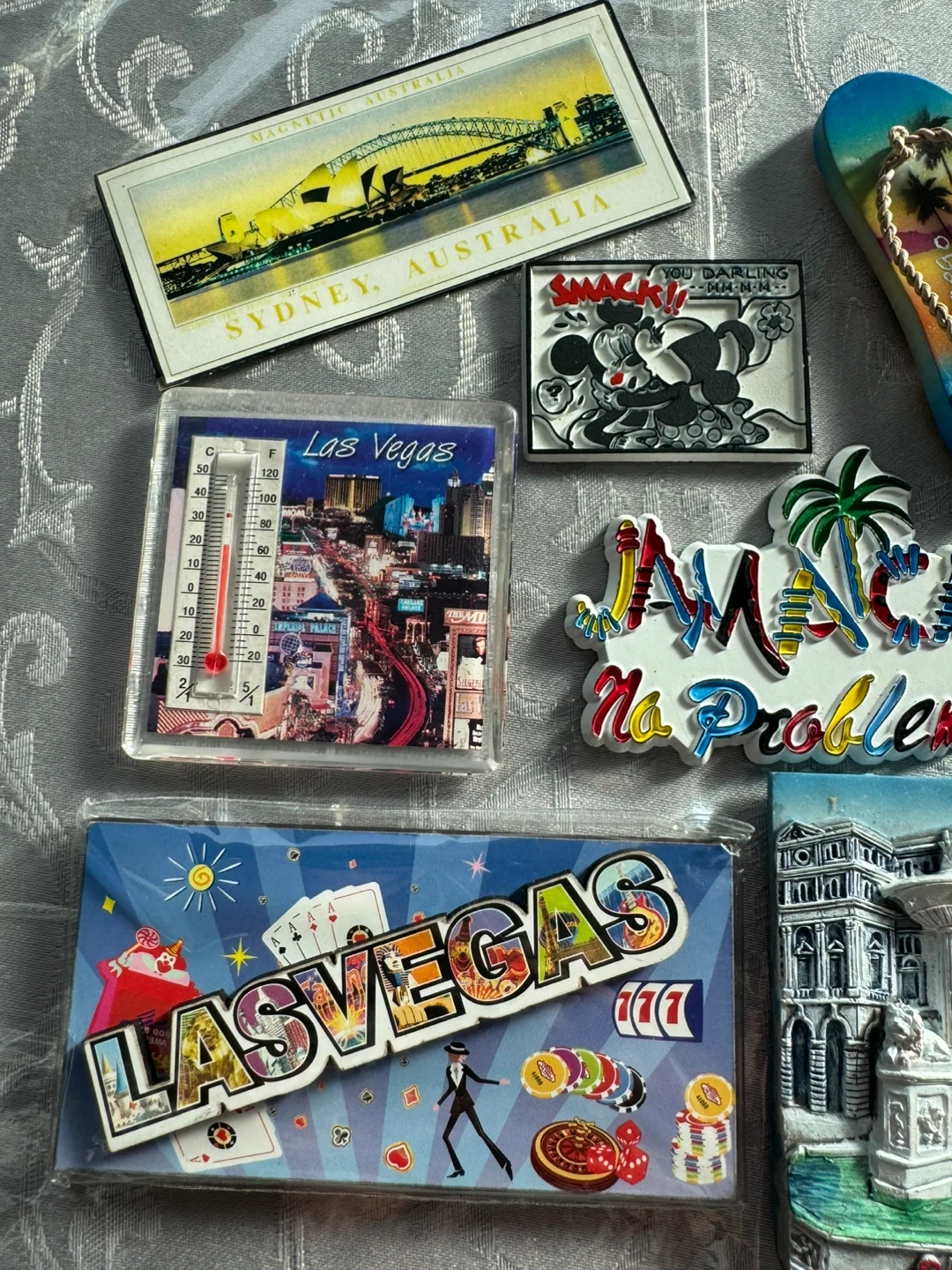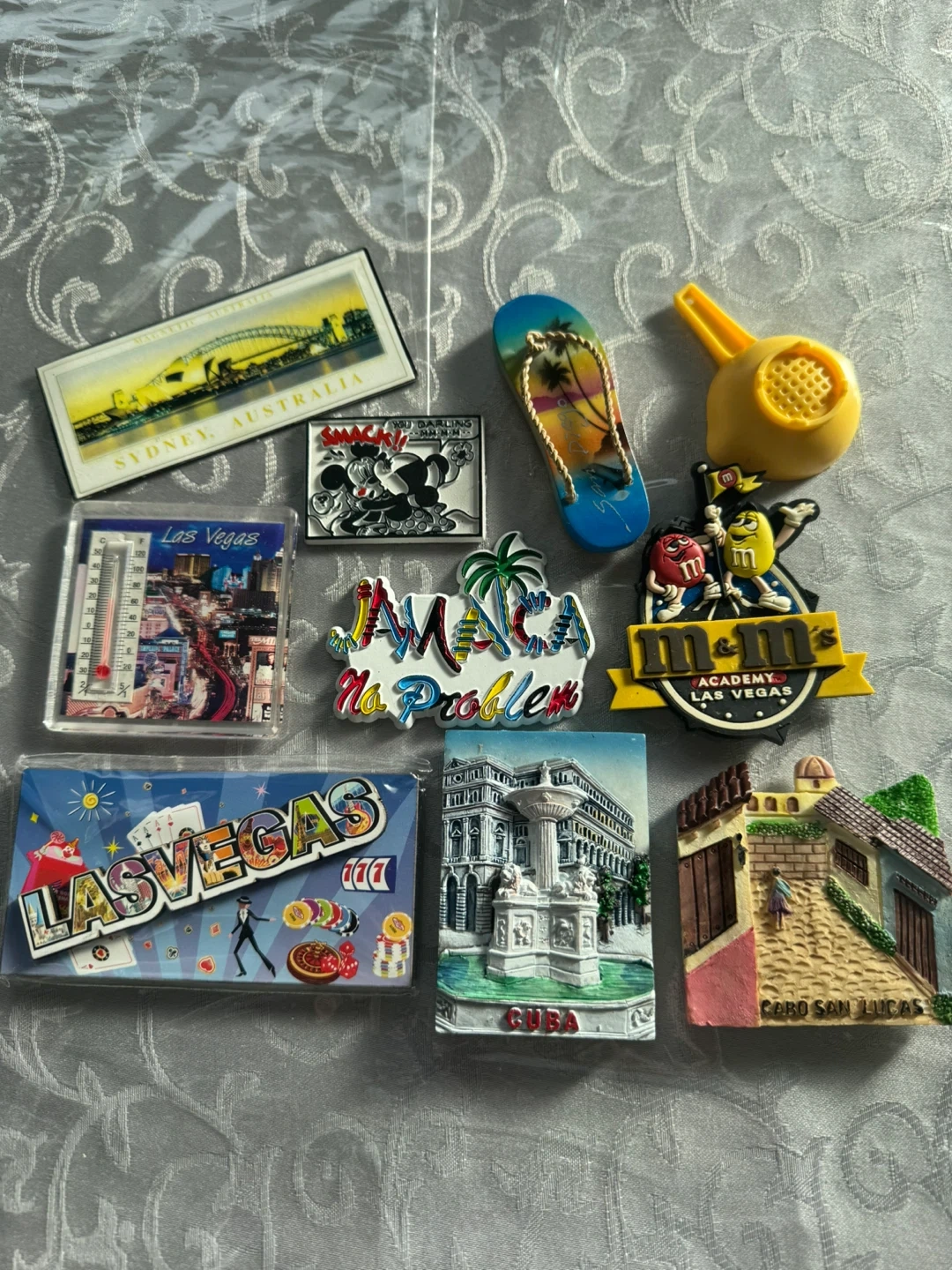A collection of souvenir magnets from various travel destinations. These include images of Sydney, Australia, Las Vegas, Jamaica, Cuba, and Cabo San Lucas. They're great for adding a personal touch to your fridge or as a memento of past trips! $3.00 each or 10 for $$20.00