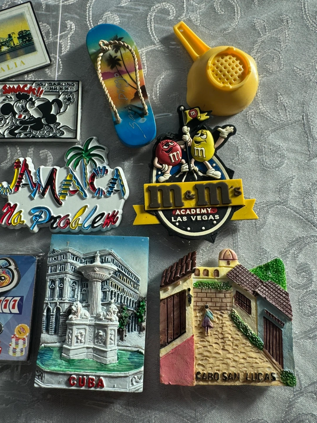 A collection of souvenir magnets from various travel destinations. These include images of Sydney, Australia, Las Vegas, Jamaica, Cuba, and Cabo San Lucas. They're great for adding a personal touch to your fridge or as a memento of past trips! $3.00 each or 10 for $$20.00