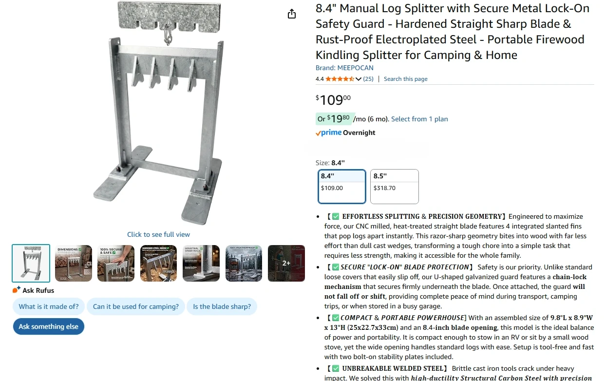 8.4" Manual Log Splitter with Secure Metal Lock-On Safety Guard - Hardened Straight Sharp Blade & Rust-Proof Electroplated Steel - Portable Firewood Kindling Splitter for Camping & Home, Brand New in the Box/Sealed