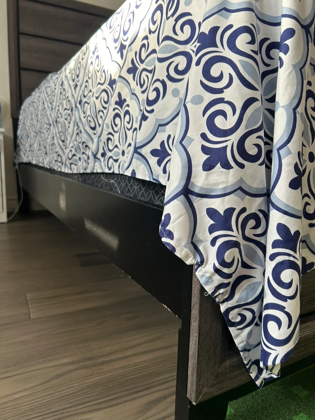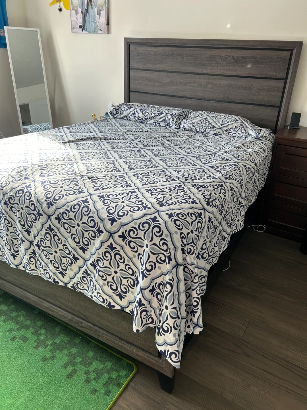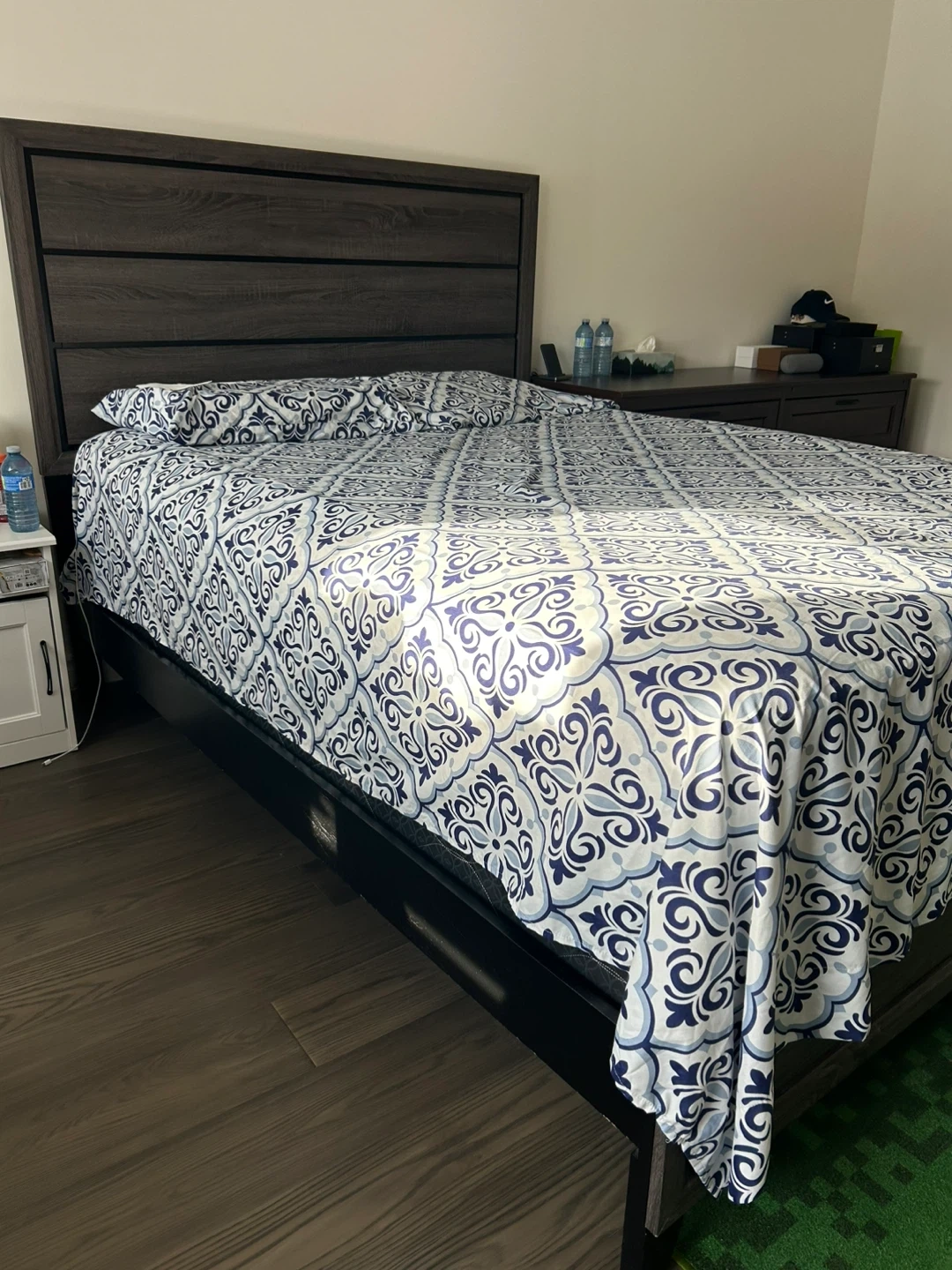 Selling a queen size bed frame. It features a modern design with a wood-like finish. Perfect for adding a touch of style to your bedroom!