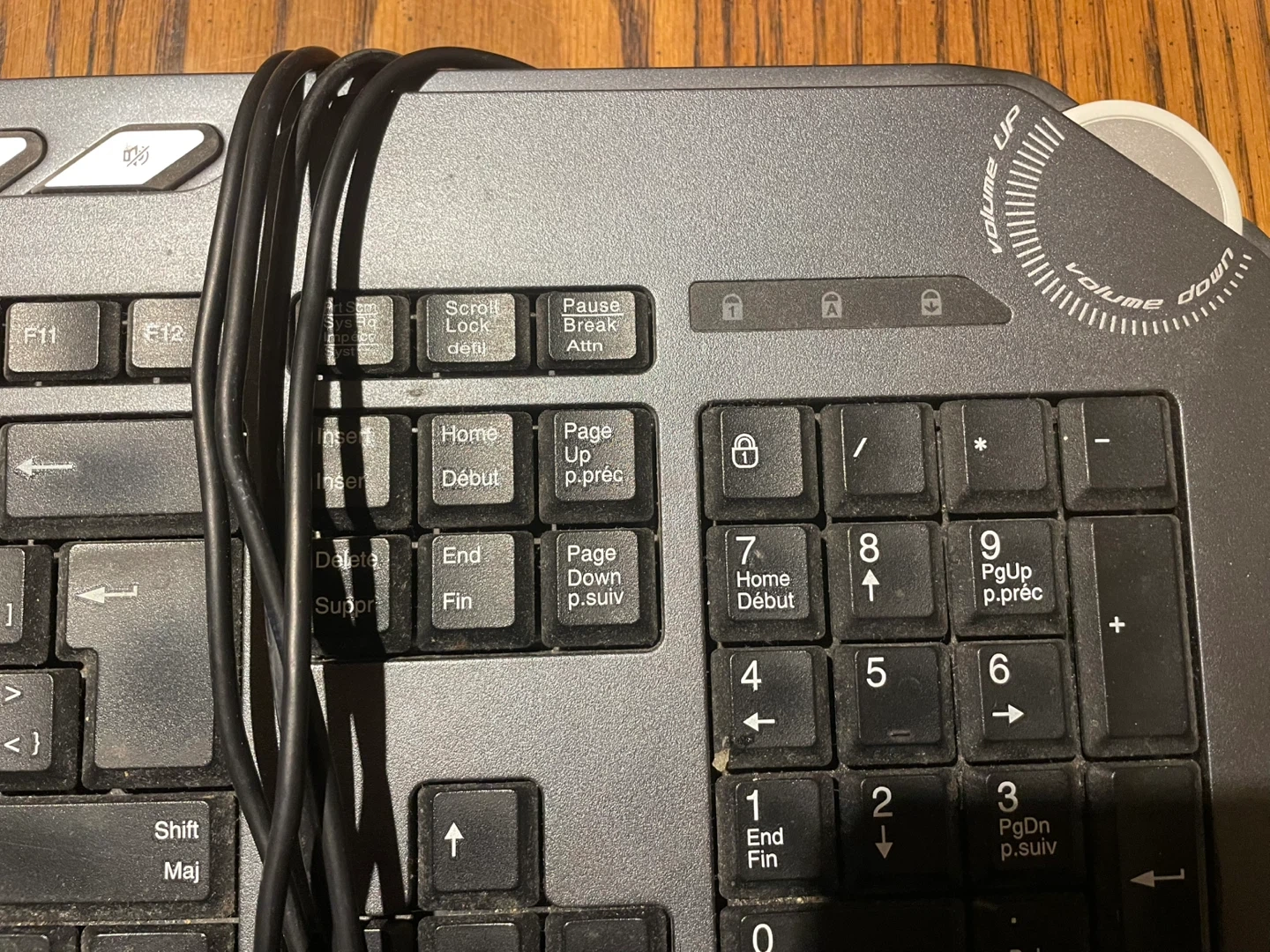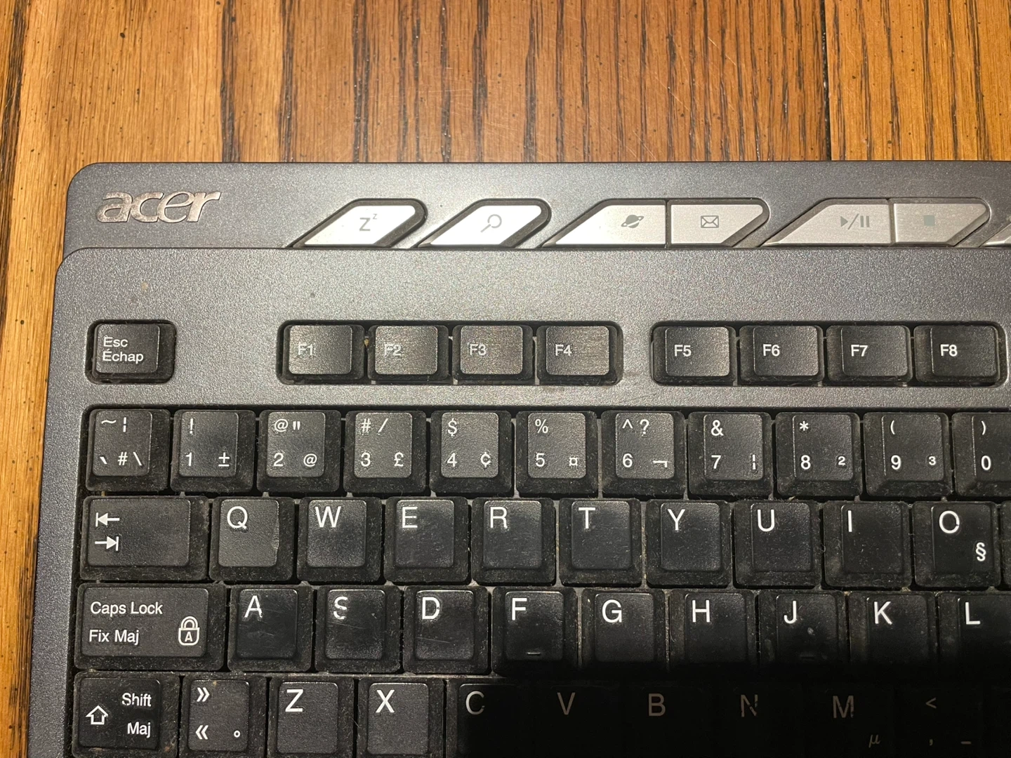 This is a grey Acer keyboard. It has standard layout with dedicated media keys. It's a wired USB keyboard.