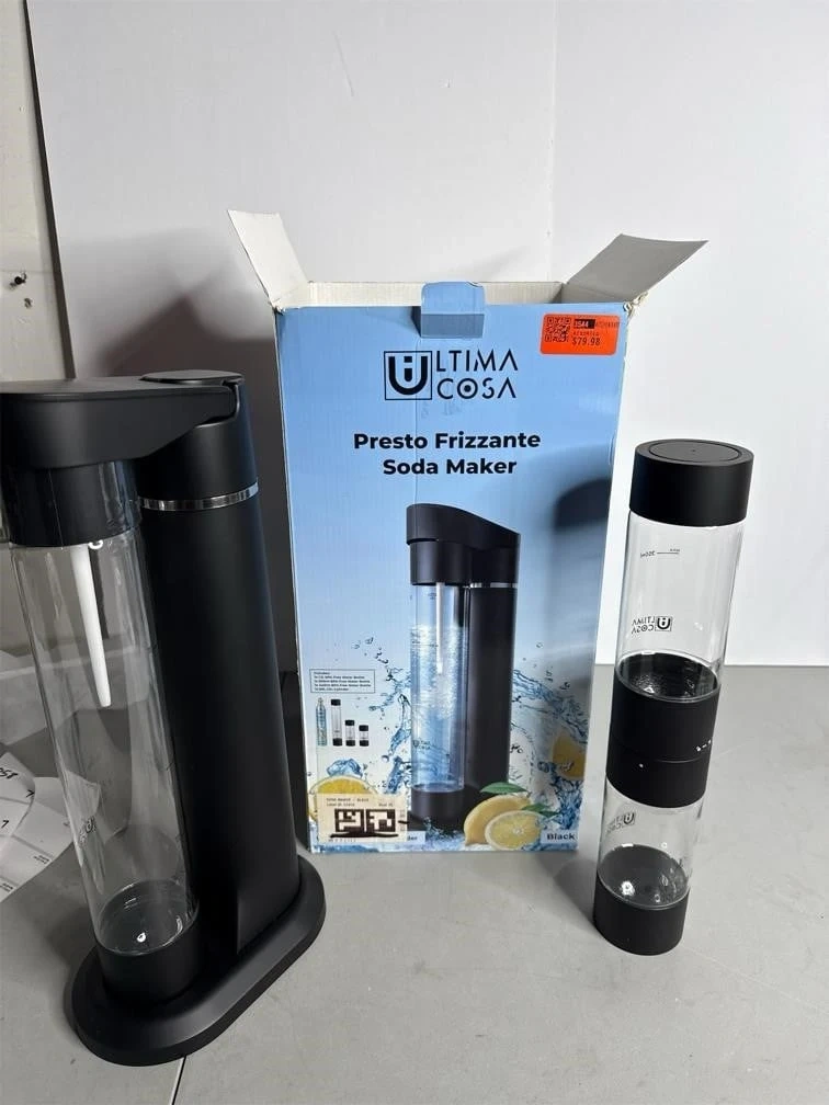 Make fresh sparkling water at home with this Ultima Cosa soda maker. It comes with the main unit and two reusable bottles. This unit uses a CO2 cylinder to carbonate water.